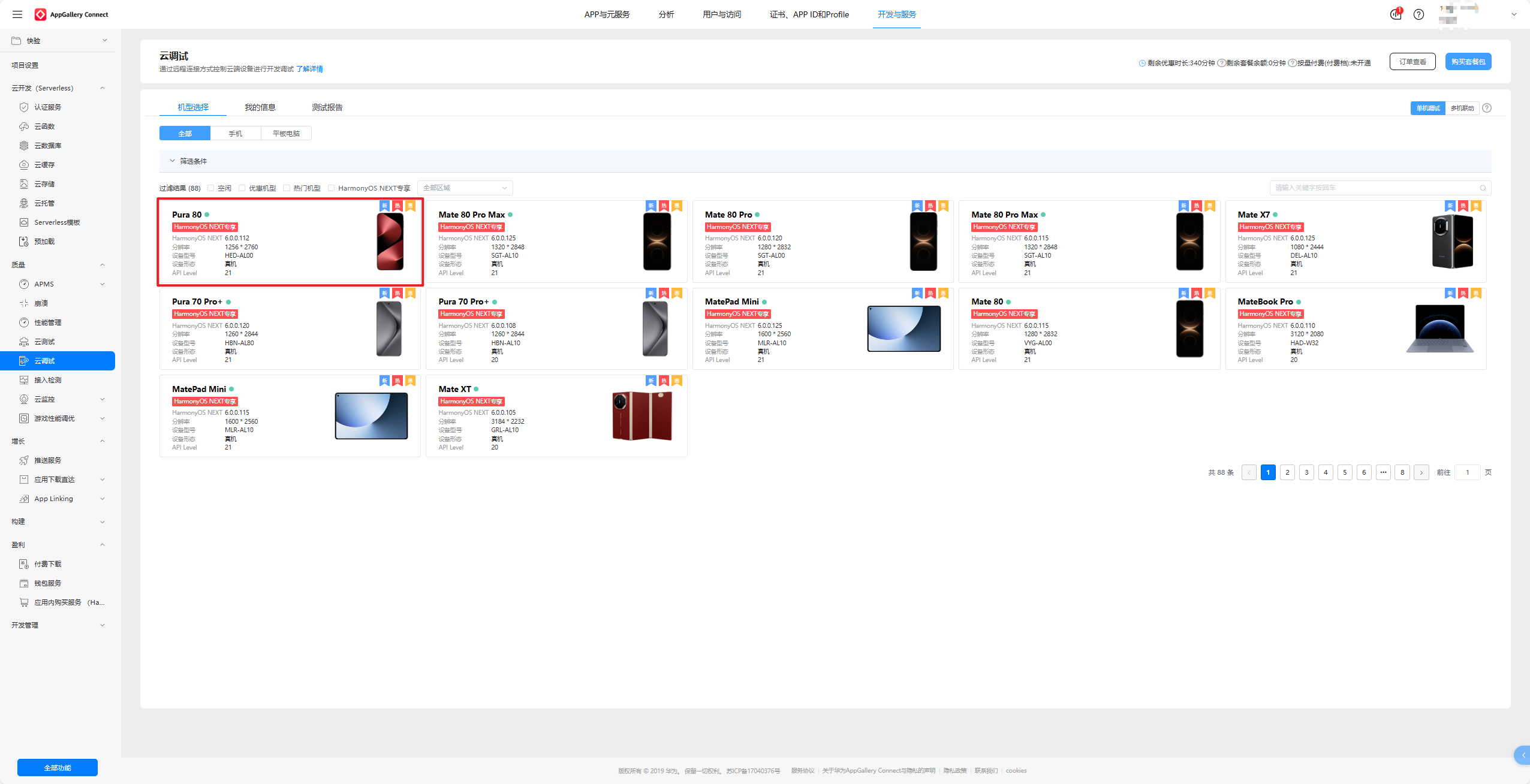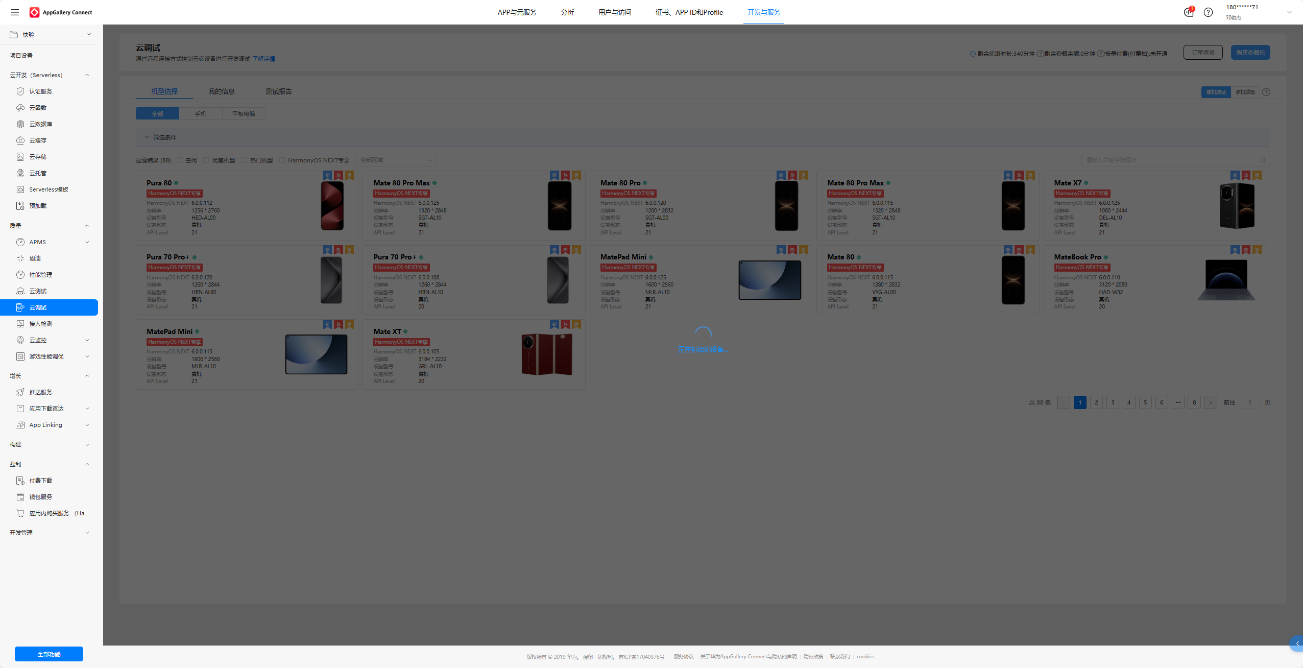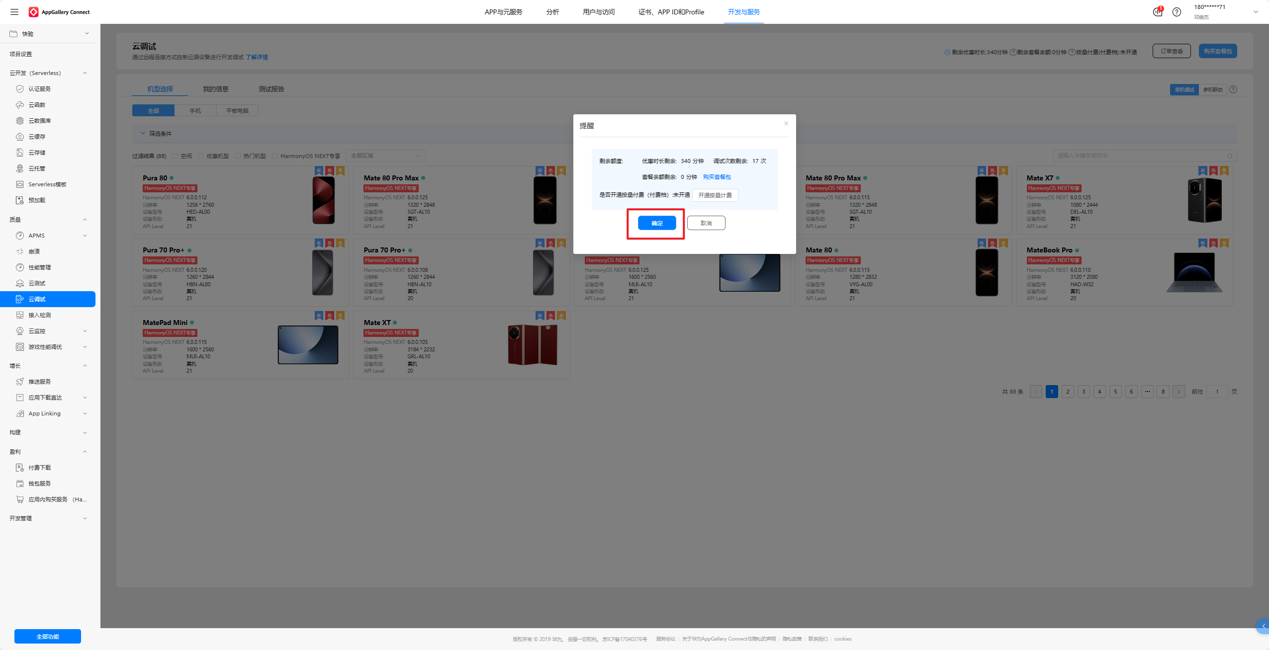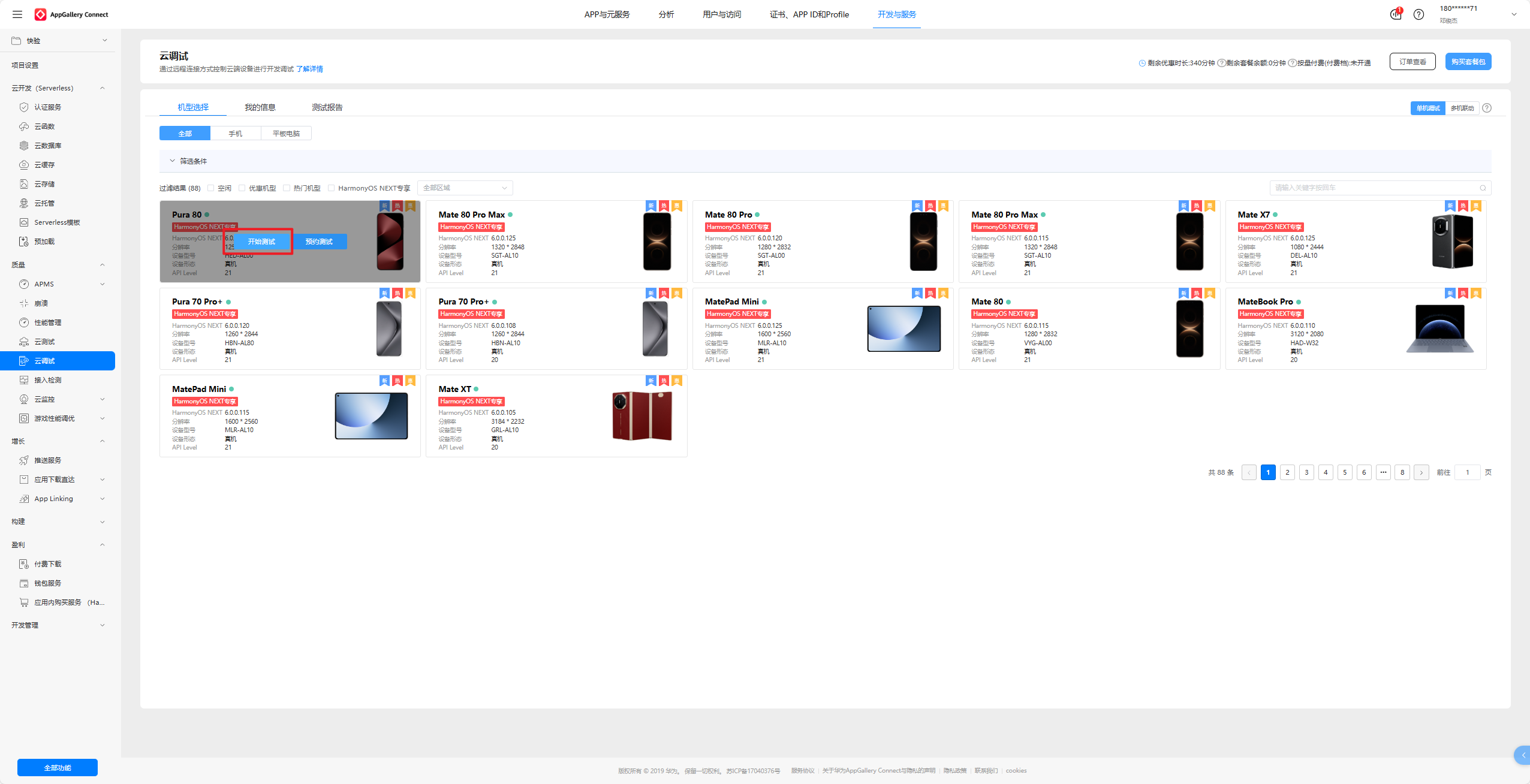 进入下面这个网址,选择任意一款云真机,我这里选择Pura 80作为演示。点击开始测试,点击确定,耐心等待初始化设备。