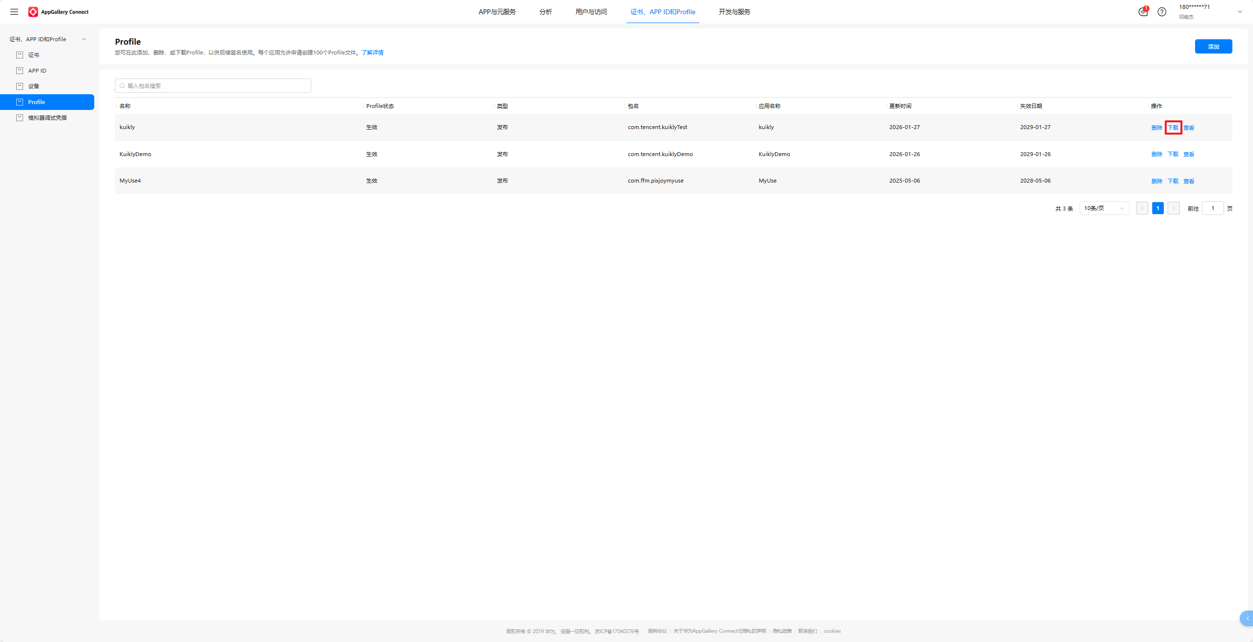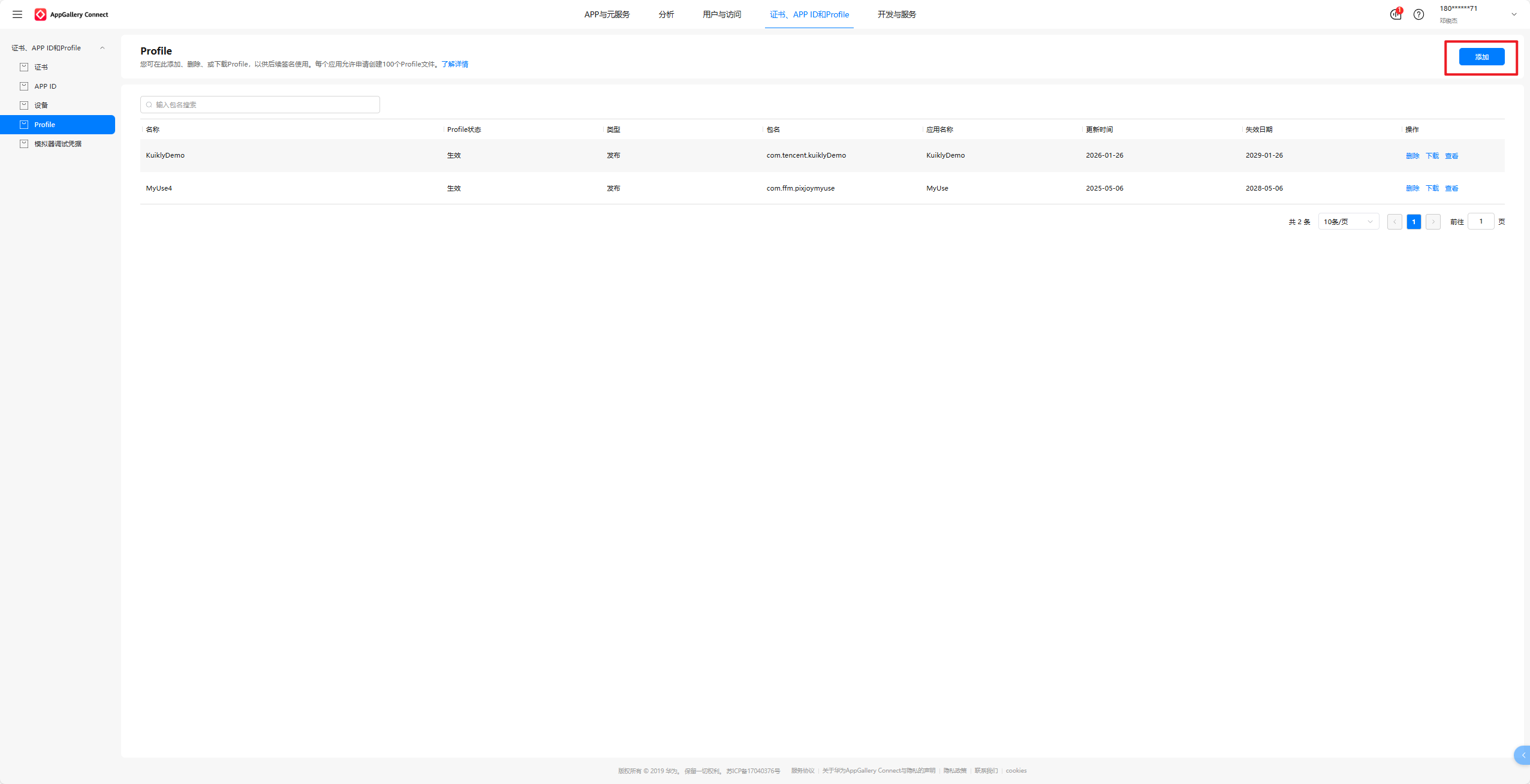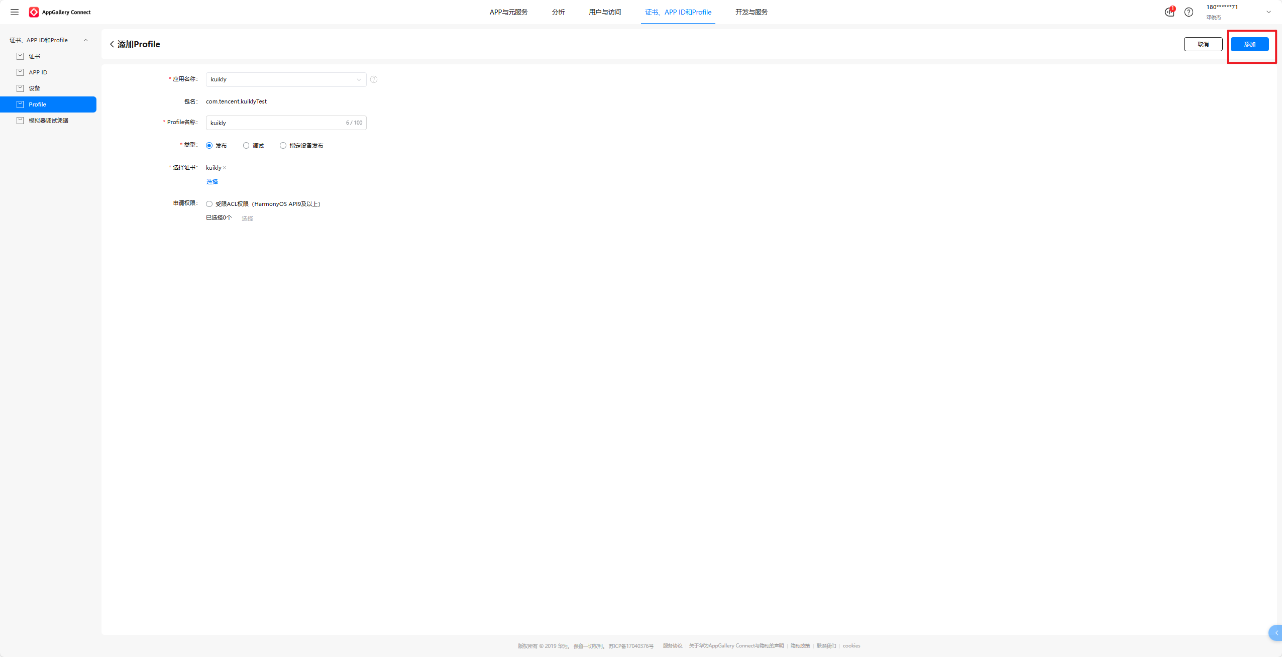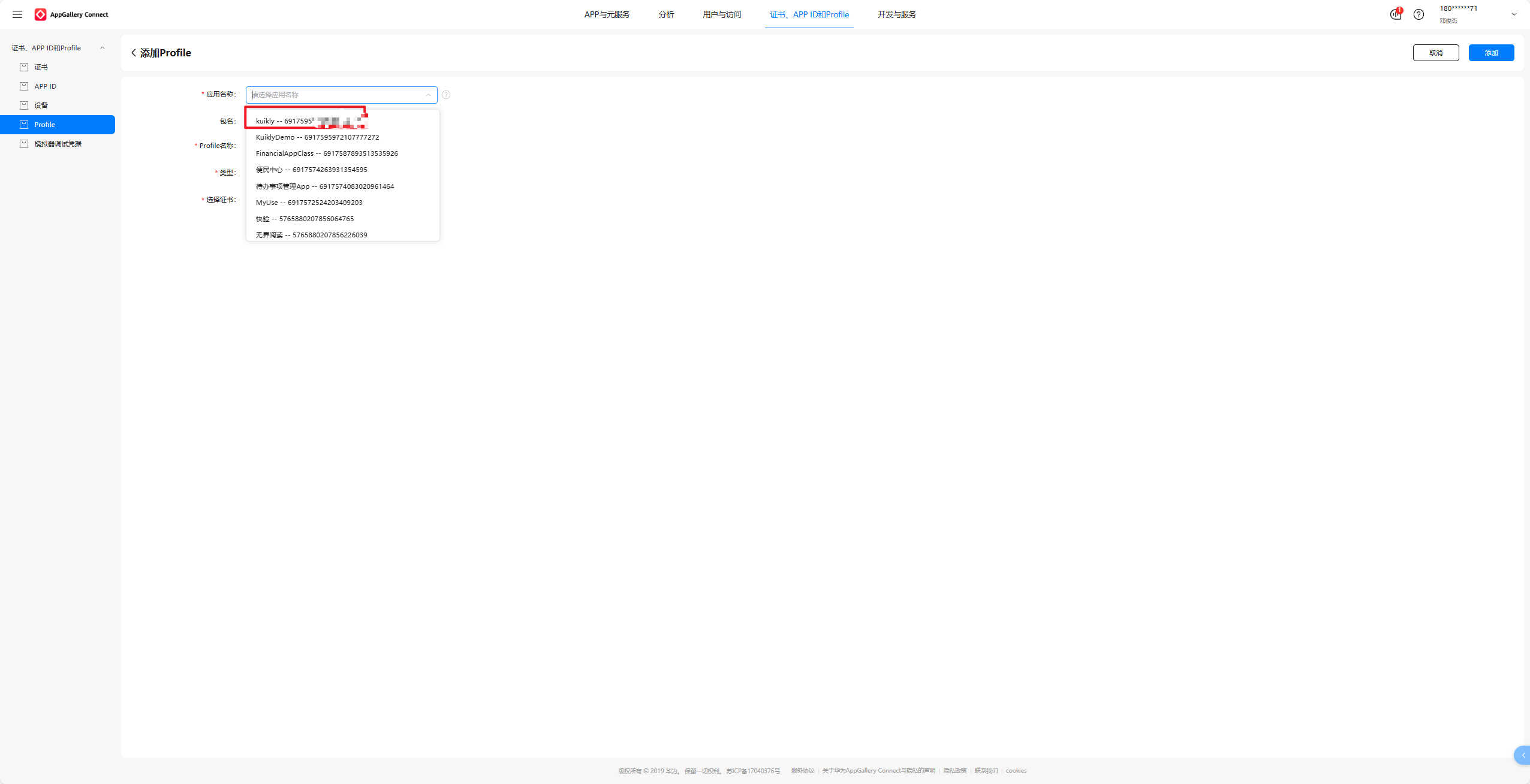 选中Profile,点击右上角的添加,选中我们刚刚新建的APP ID:kuikly