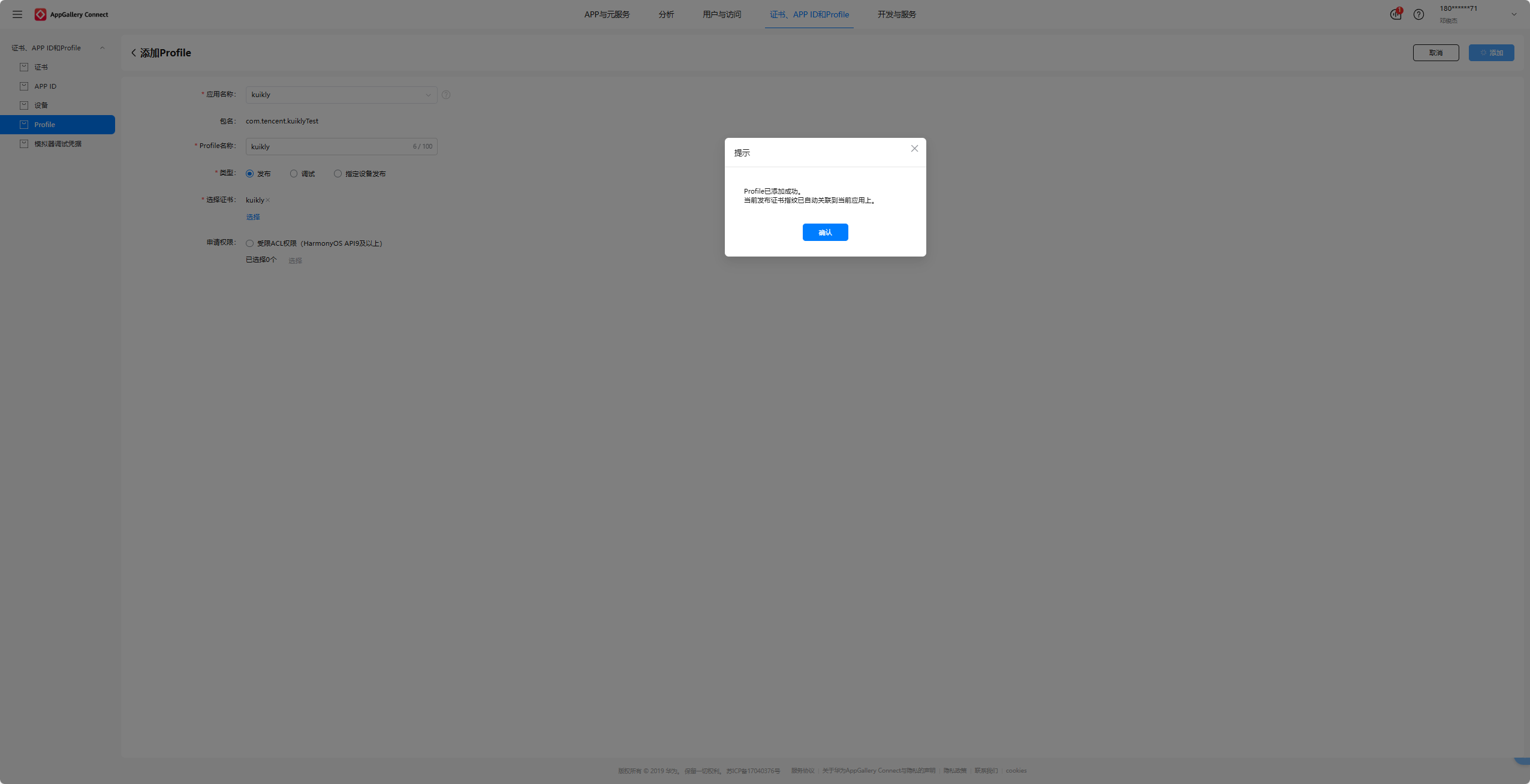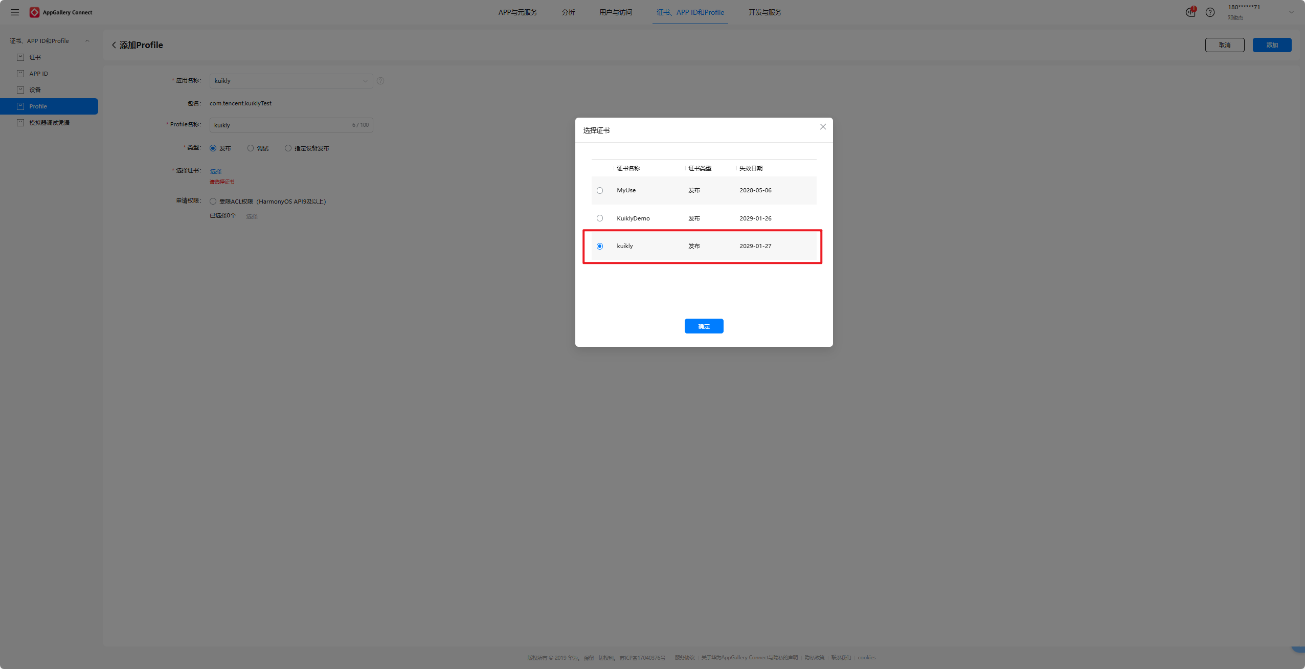 证书选择我们刚刚新建的kuikly并点击确定。最后再点击添加即可,