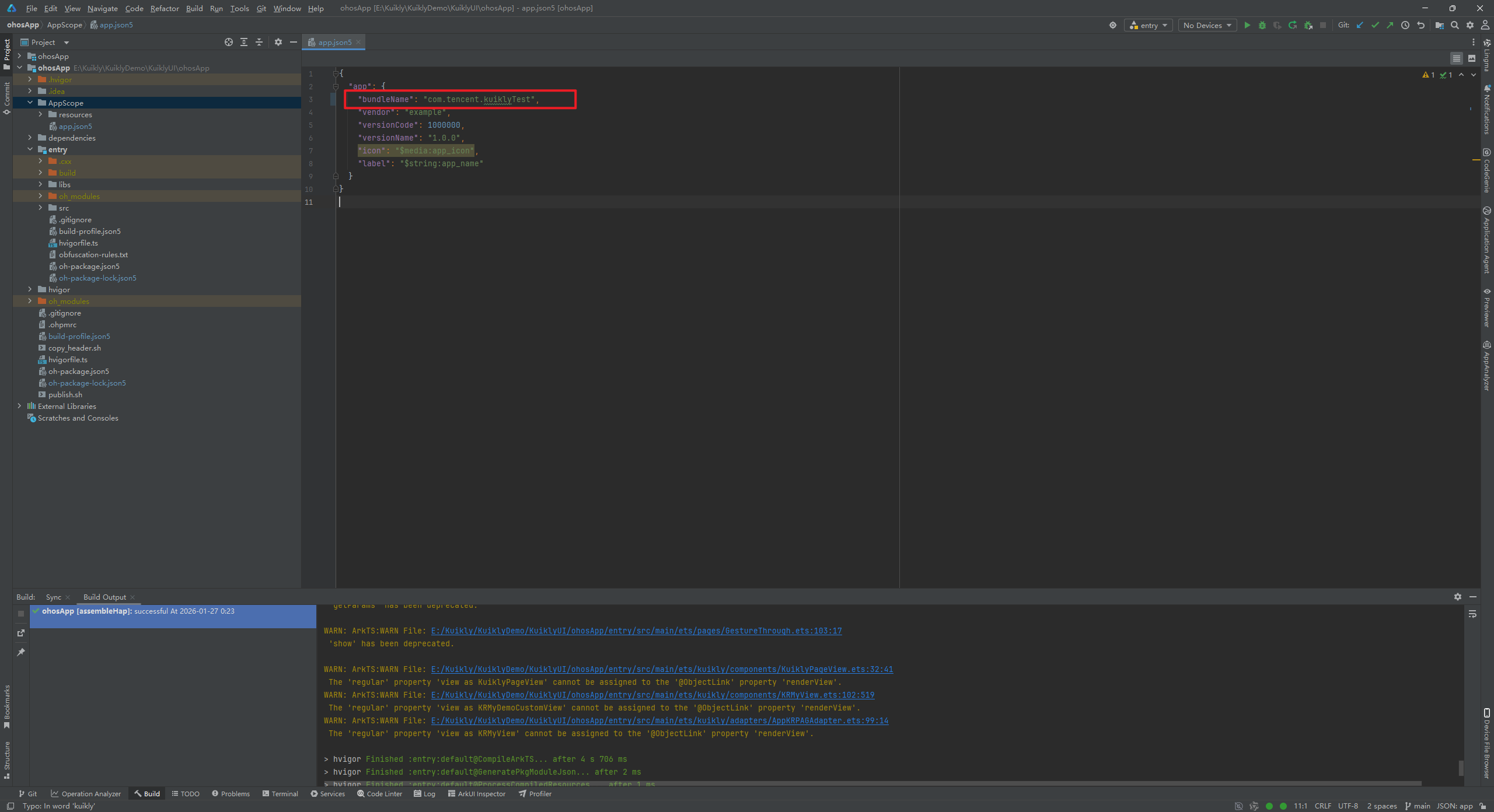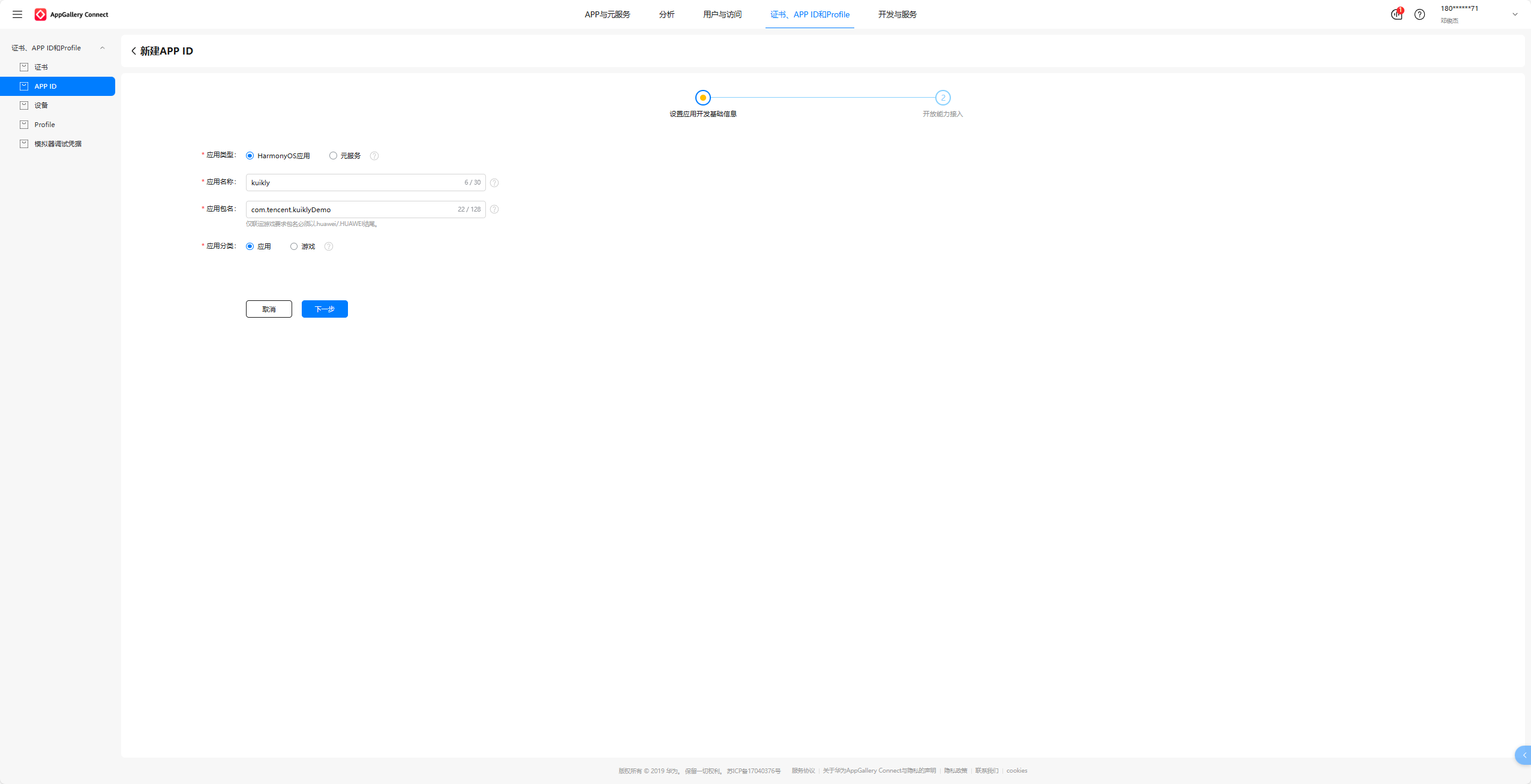 填写好应用名称和应用包名。应用包名如果忘记了,可以在AppScope文件夹下的app.json5文件中看"bundleName"的包名,图中我的包名为"com.tencent.kuiklyDemo"。