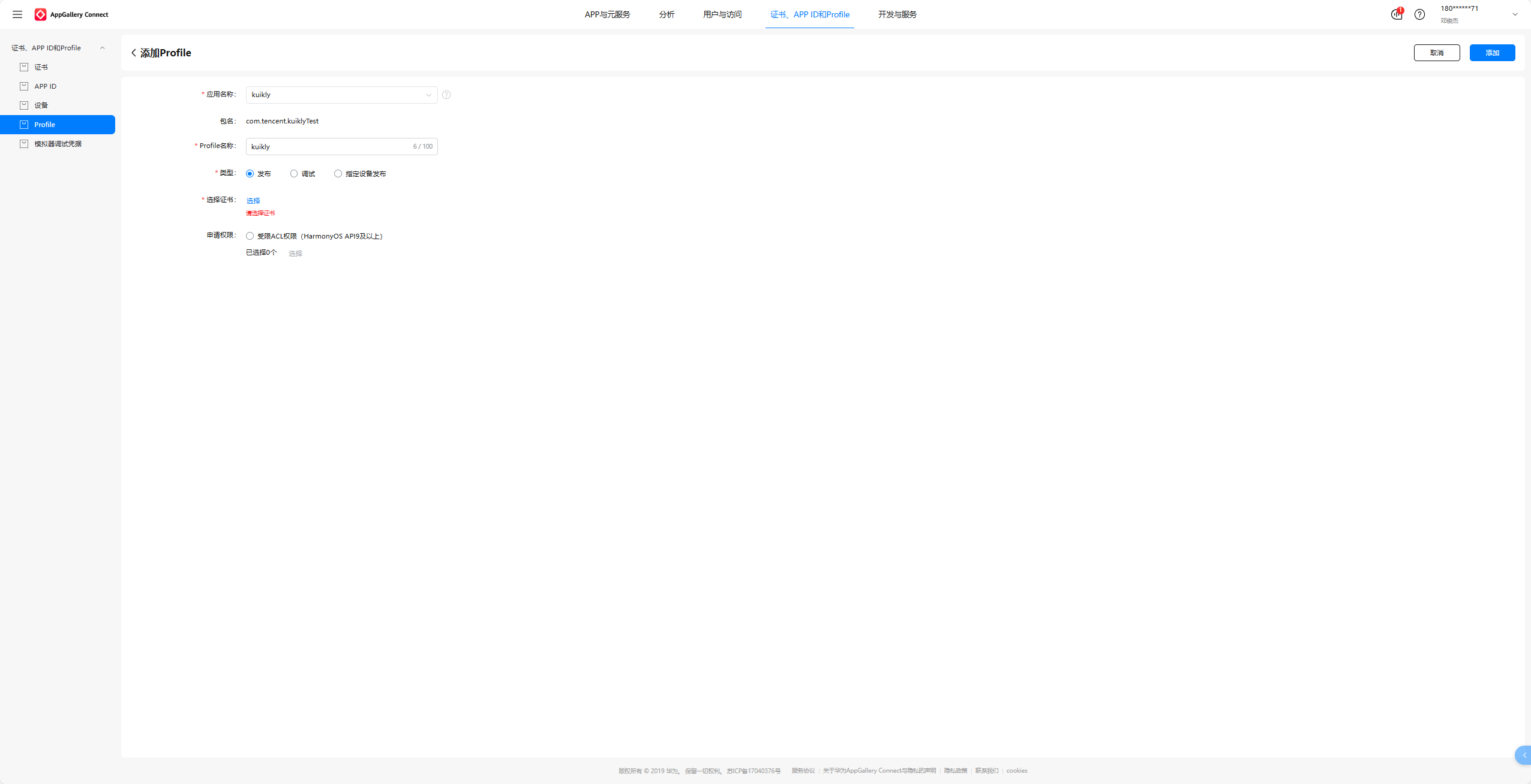 Profile名称也叫kuikly,类型选择发布,再选择证书