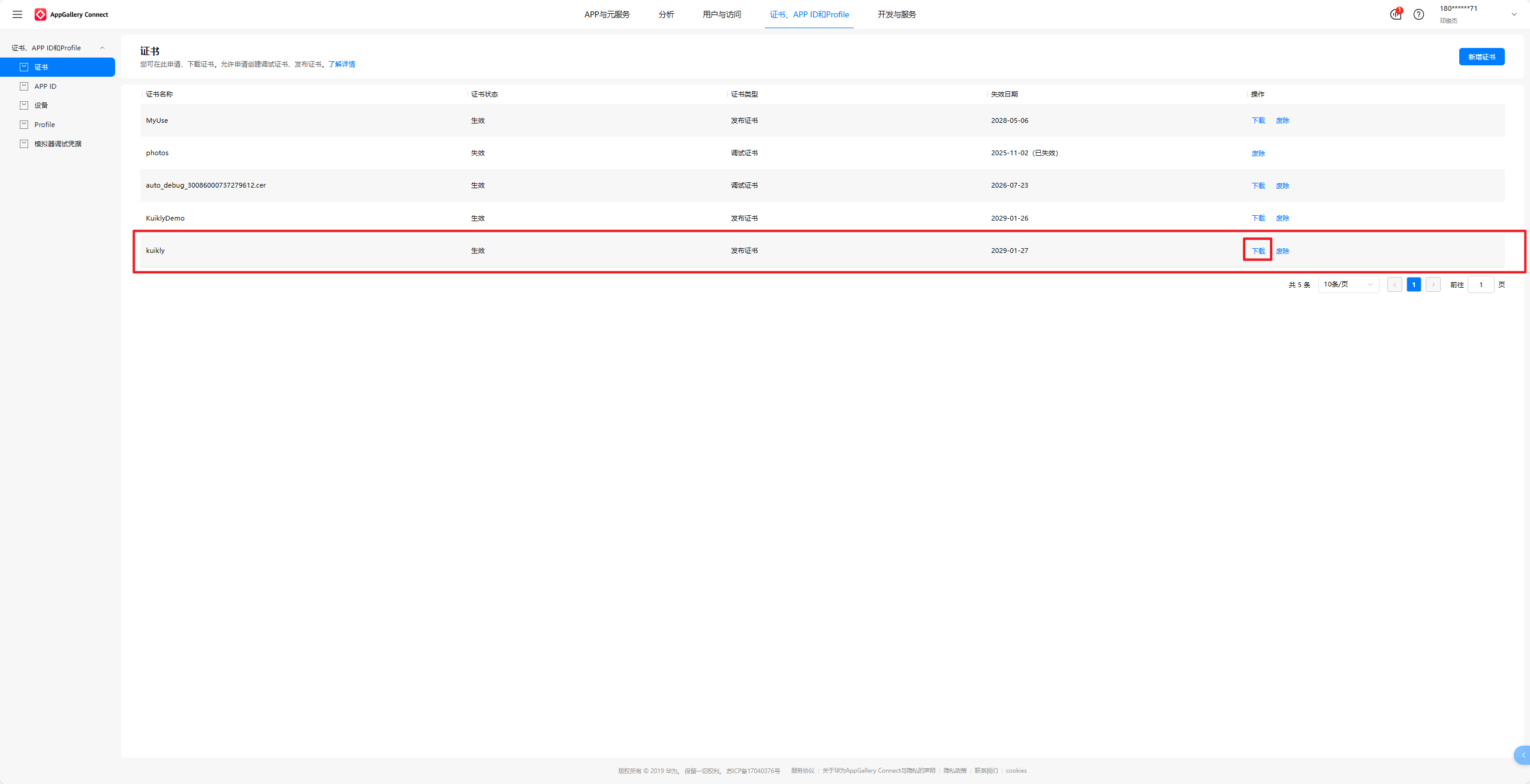 如图所示,这是我们刚刚新建好的.cer文件,点击下载即可得到该文件。