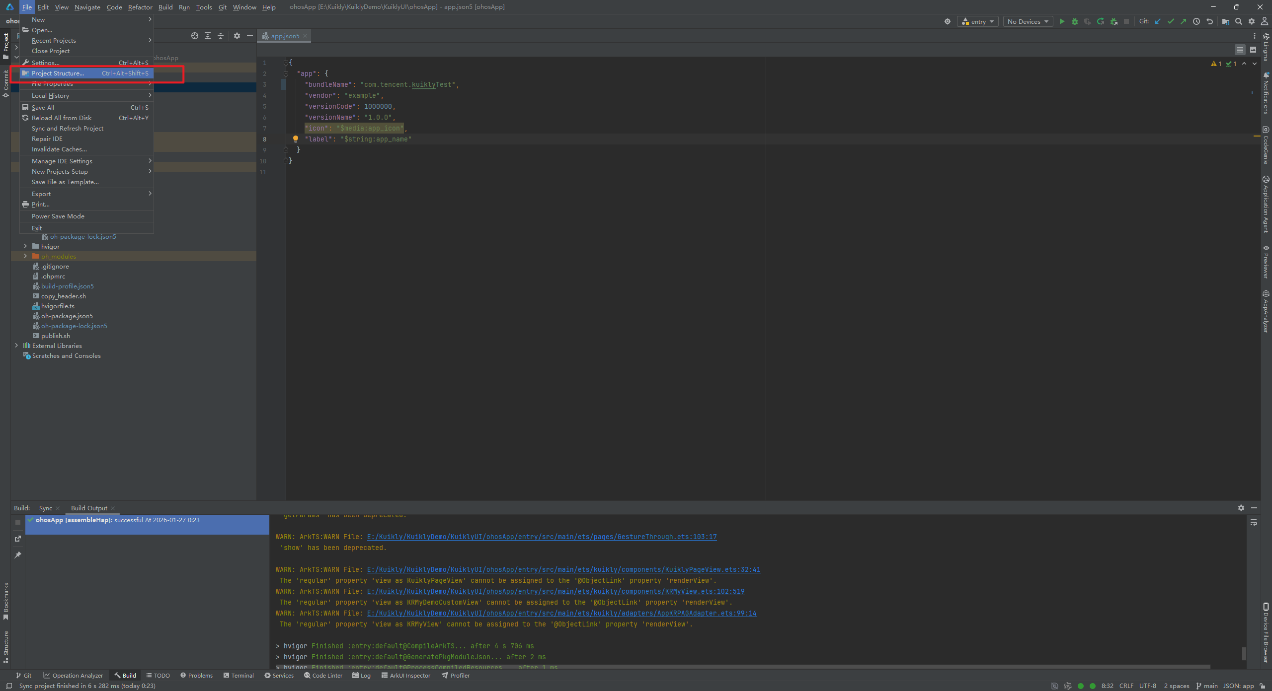 回到DevEco Studio,点击左上角的File中的Project Structure。再切换至Signing Configs的选项进行手动配置。