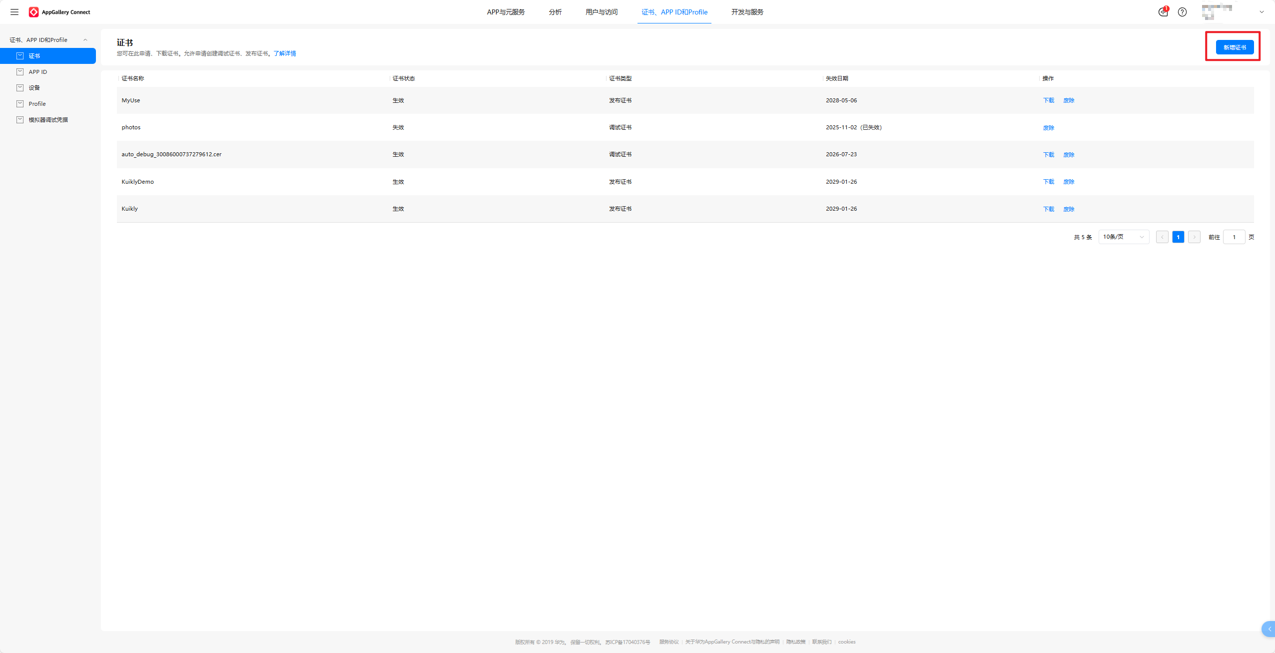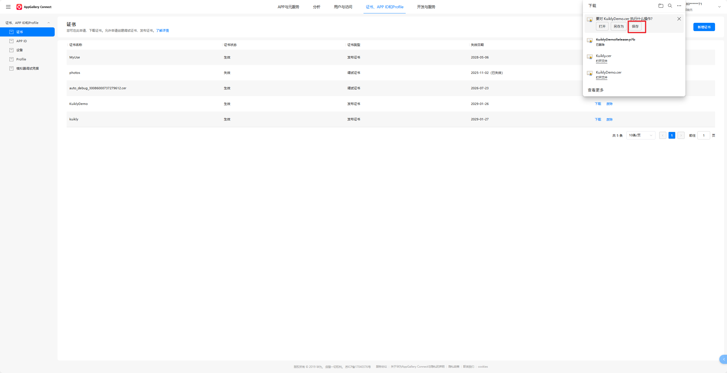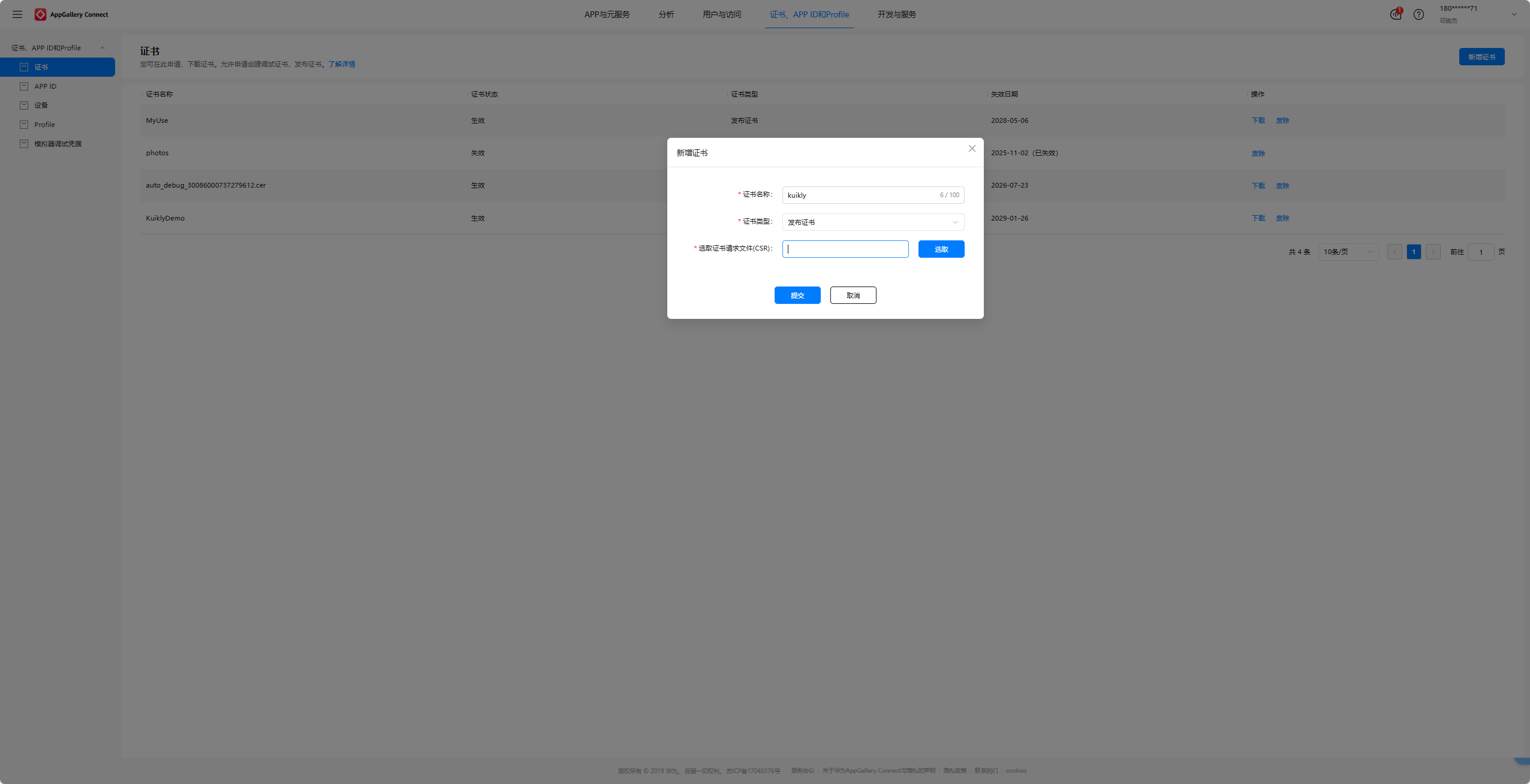 进入该链接:AppGallery Connect,点击新增证书。证书名称我们填写:kuikly,证书类型有两种,分别是:调试证书和发布证书,我们选择发布证书即可。最后选取我们在1.2小节新建的CSR文件,选择好后点击提交即可。