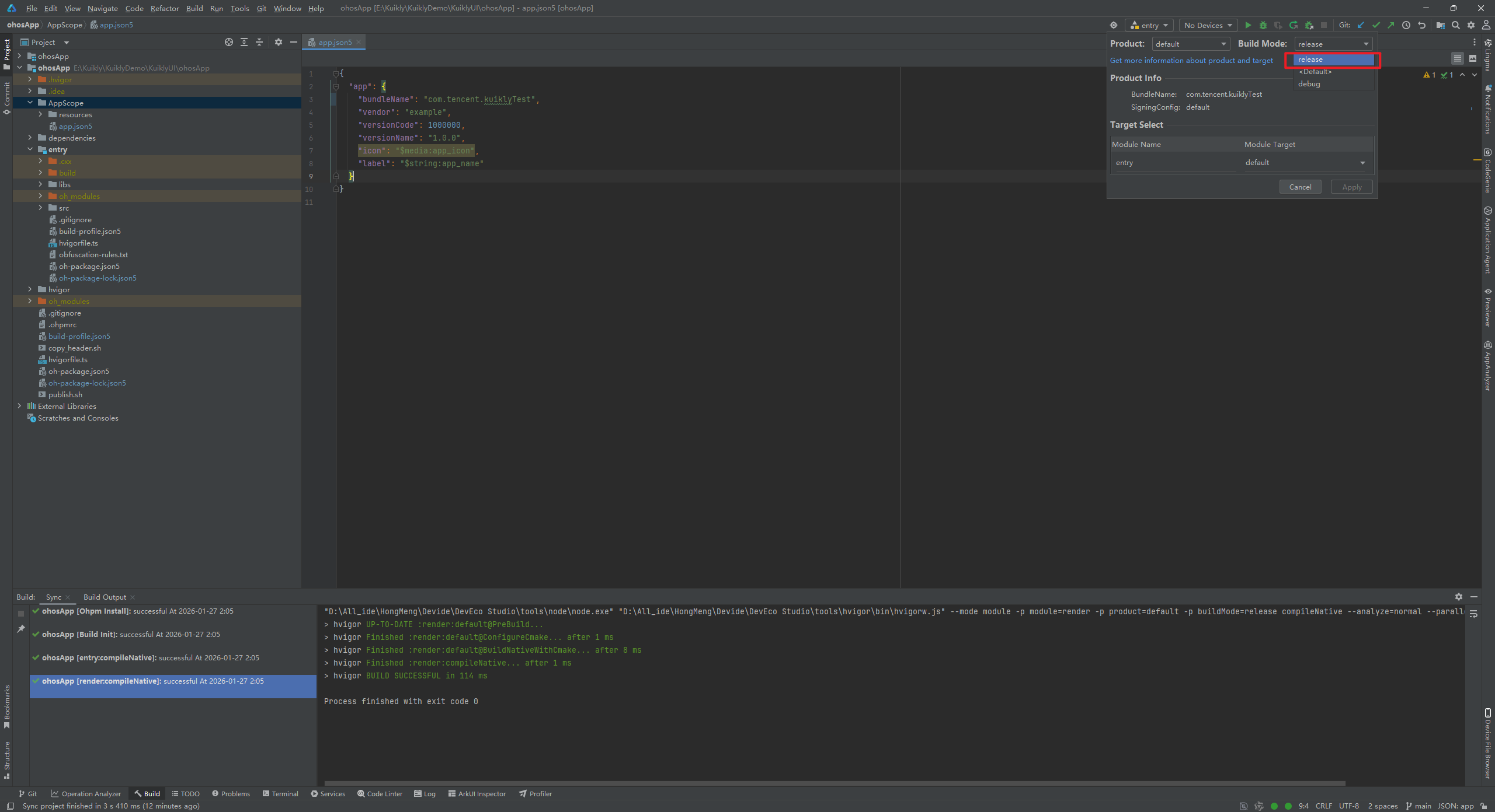 打包之前需要修改Build Mode的模式,否则云真机上会报错:“应用非Release版本,请上传Release版本应用”
