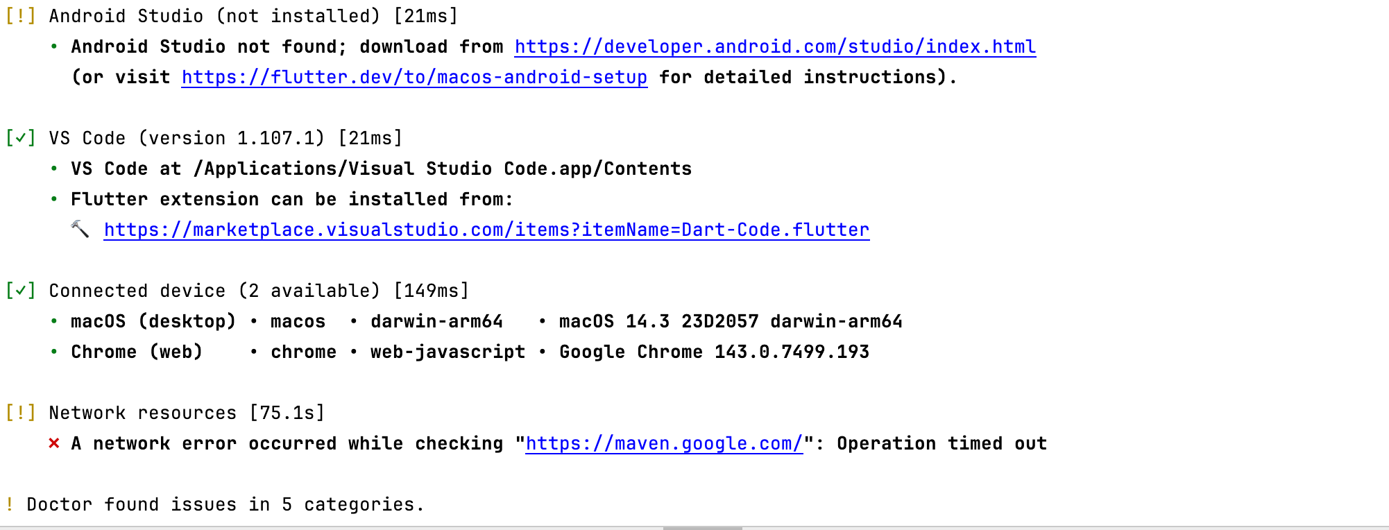 对于 Android toolchain、Xcode 等红叉问题,若仅开发开源鸿蒙应用,可直接忽略,无需安装相关工具;若出现网络超时(如访问maven.google.com失败),是国内网络环境的正常现象,不影响核心开发。