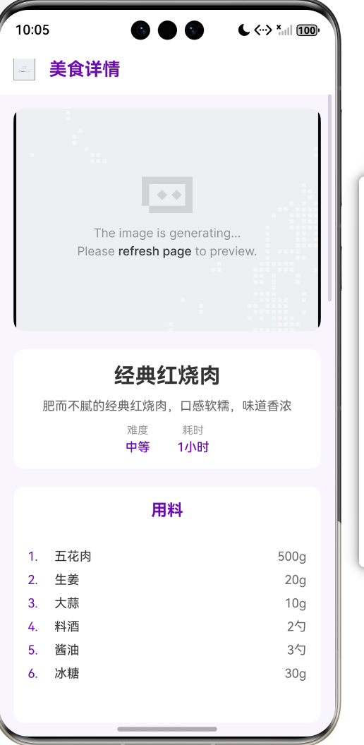 - 模拟接口返回数据(美食分类、食谱列表、详情信息),遵循真实接口请求流程(请求→解析→渲染)。