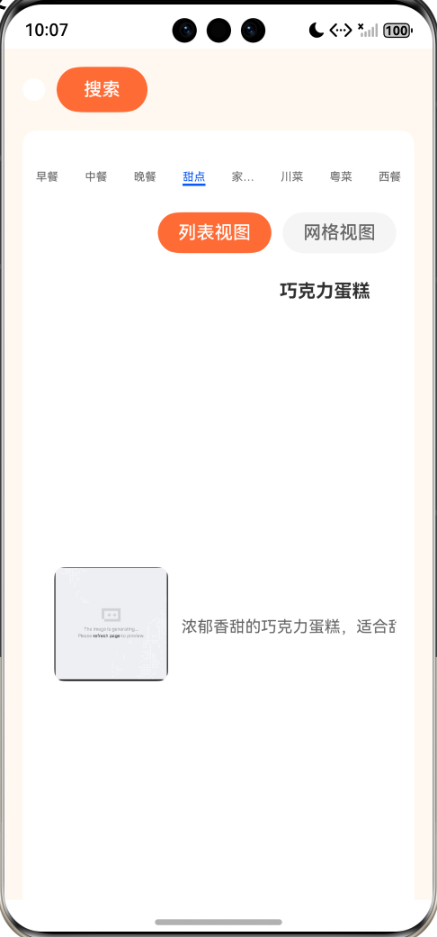 - 分类页:分类标签切换 + 食谱列表 / 网格视图切换 + 搜索功能,按分类筛选食谱;