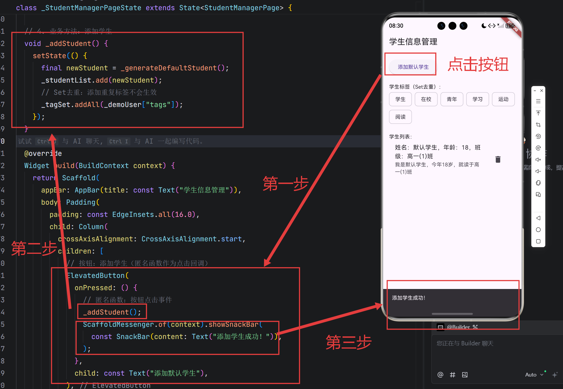 第三步:显示一个提示消息,内容是“添加学生成功”。