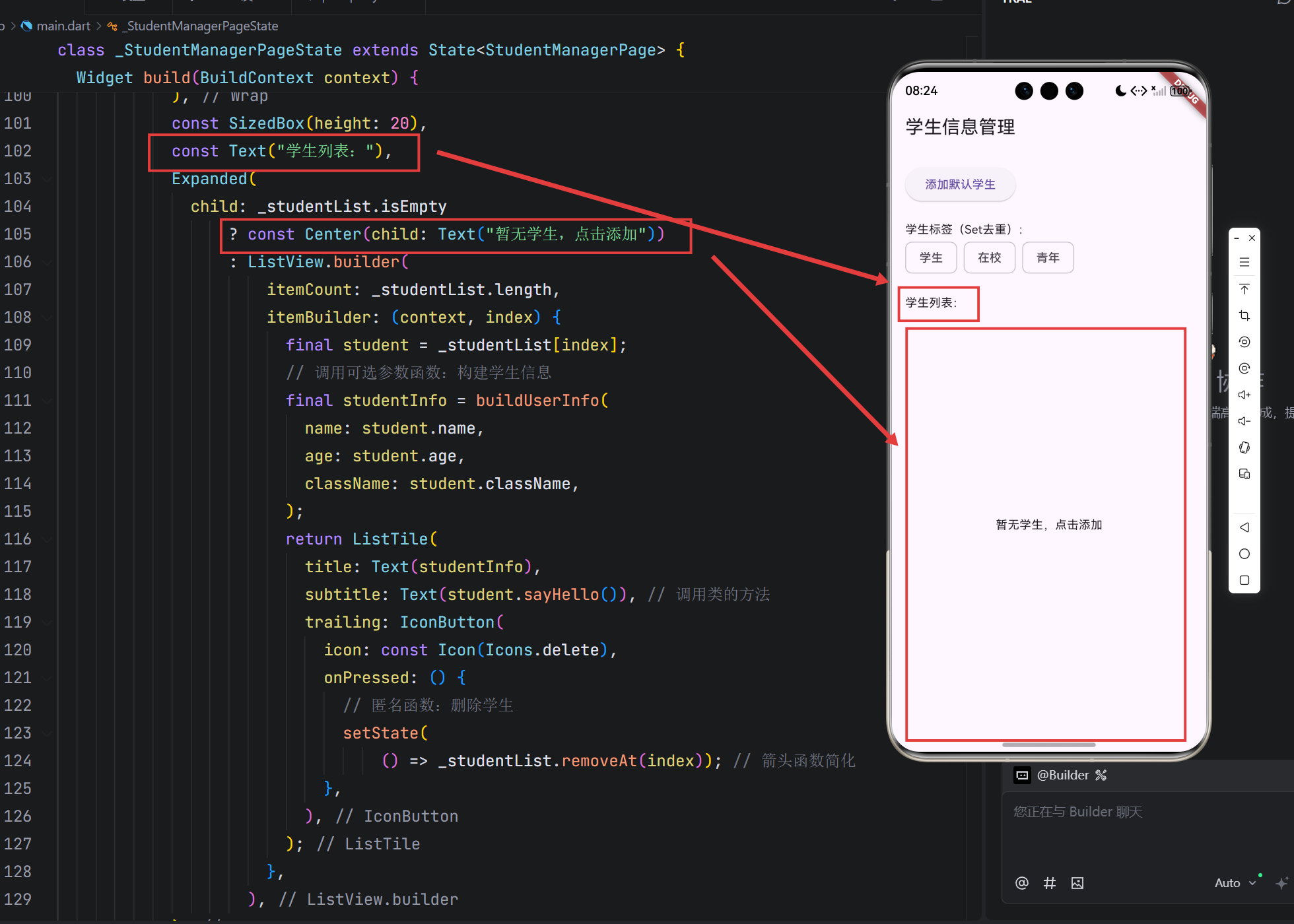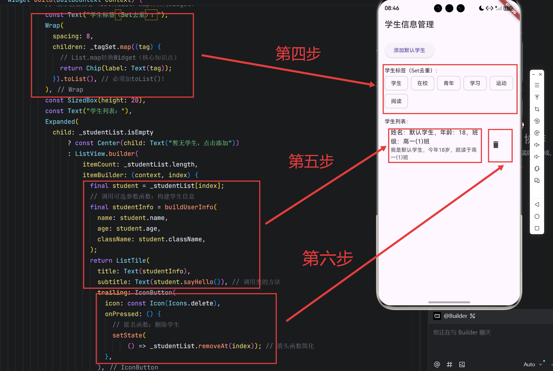 组件的使用看不懂没关系,之后还会学,这个案例的价值不仅在于语法的实践,更在于展示了如何将 Dart 语言特性与 Flutter 组件开发结合。