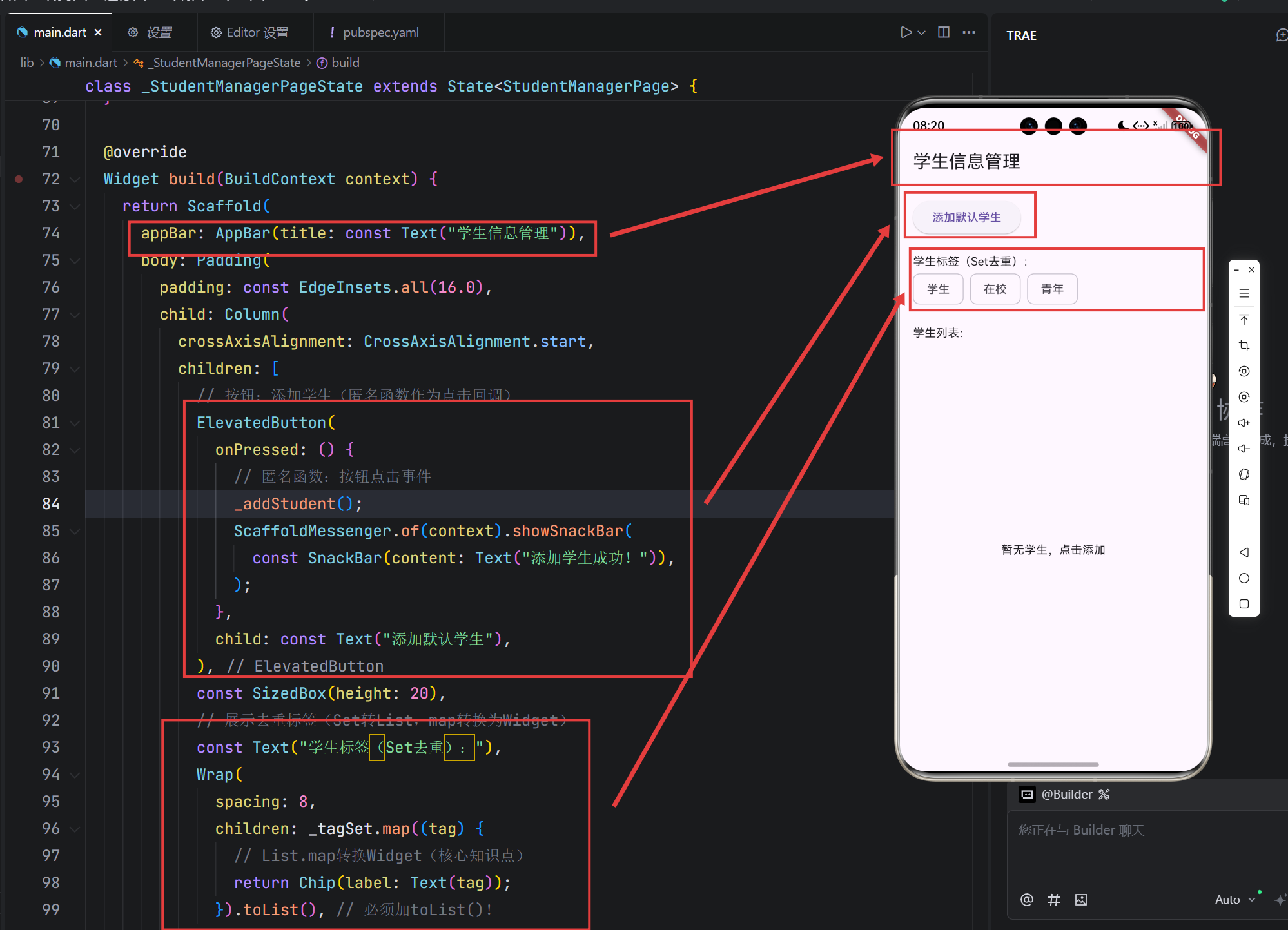 这个程序中用到很多知识,包括函数、集合、类,大家可以好好看一下这个案例,了解一下它的执行流程。通过这个案例,我们系统地落地了 Dart 语言的核心语法特性,从基础的集合操作(List/Set/Map)、函数用法(可选参数、箭头函数、匿名函数),到面向对象编程(类的继承、方法重写),再到空安全处理等现代 Dart 特性,都在实际的 Flutter 界面开发中得到了体现。