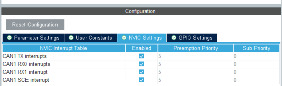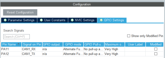 - GPIO 配置:CAN_TX/RX 引脚保持 CubeMX 默认的复用功能(如 CAN1 对应 PA11/PA12,AF9 复用),无需手动修改。