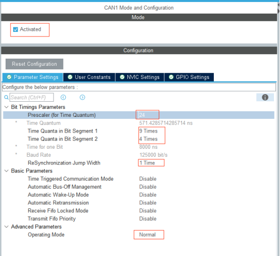 - 分频系数(Prescaler):24(若需 1Mbps 波特率,可改为 3);