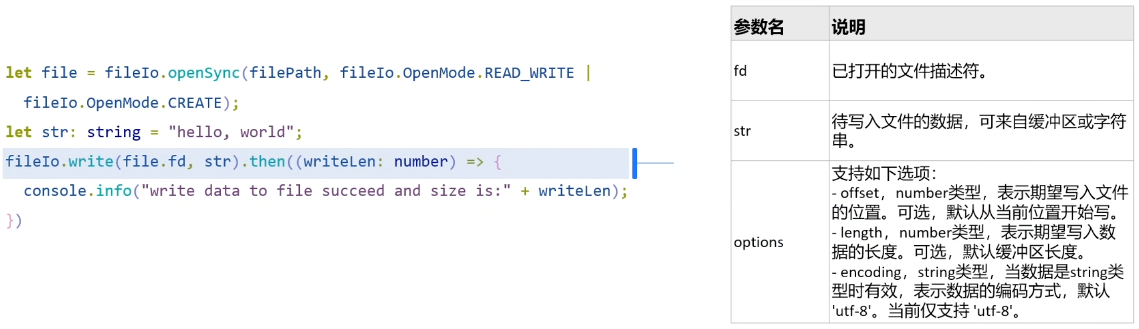 write(fd: number, buffer: ArrayBuffer | string, options?: WriteOptions): Promise<number>将数据写入文件,使用Promise异步返回。