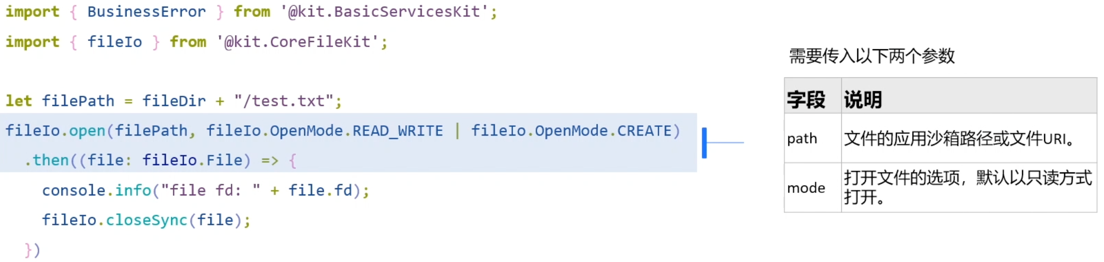 open(path: string, mode?: number): Promise<File> 用于打开文件,使用Promise异步返回。支持使用URl打开文件。
