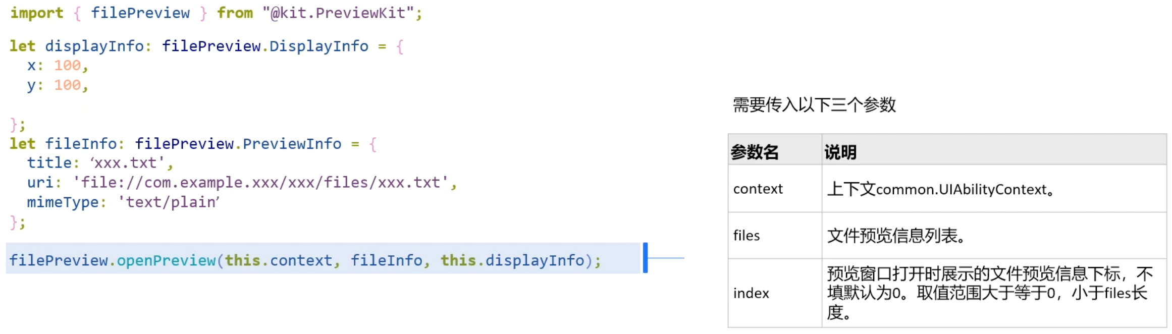 通过传入多个文件预览信息以及选择展示的文件信息下标,打开预览窗口。1秒内重复调用无效。使用Promise方式异步返回结果。