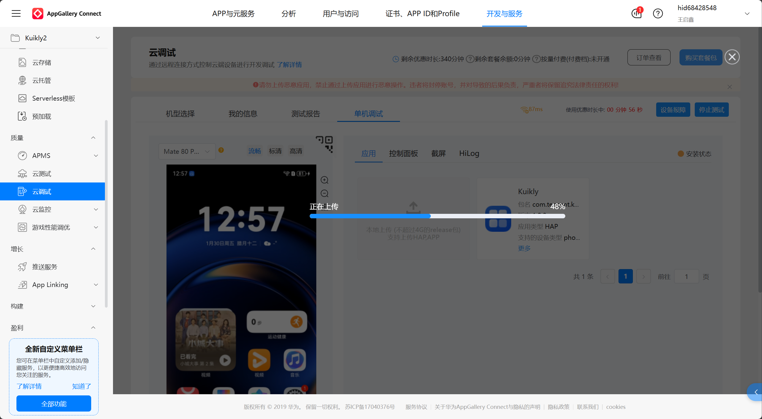 通过证书与签名文件准备,DevEco Studio 签名配置和构建HAP包之后,申请测试云真机