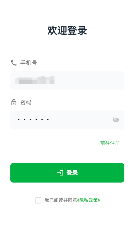登录页面包含手机号和密码输入、表单验证、隐私政策同意、API 调用、用户信息保存并且跳转首页等核心功能。