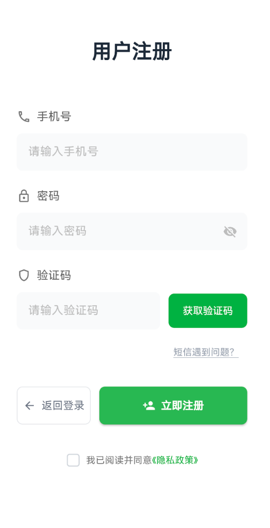 该页面包含手机号、密码、验证码输入,短信验证码发送与倒计时,表单验证,隐私政策同意与否。