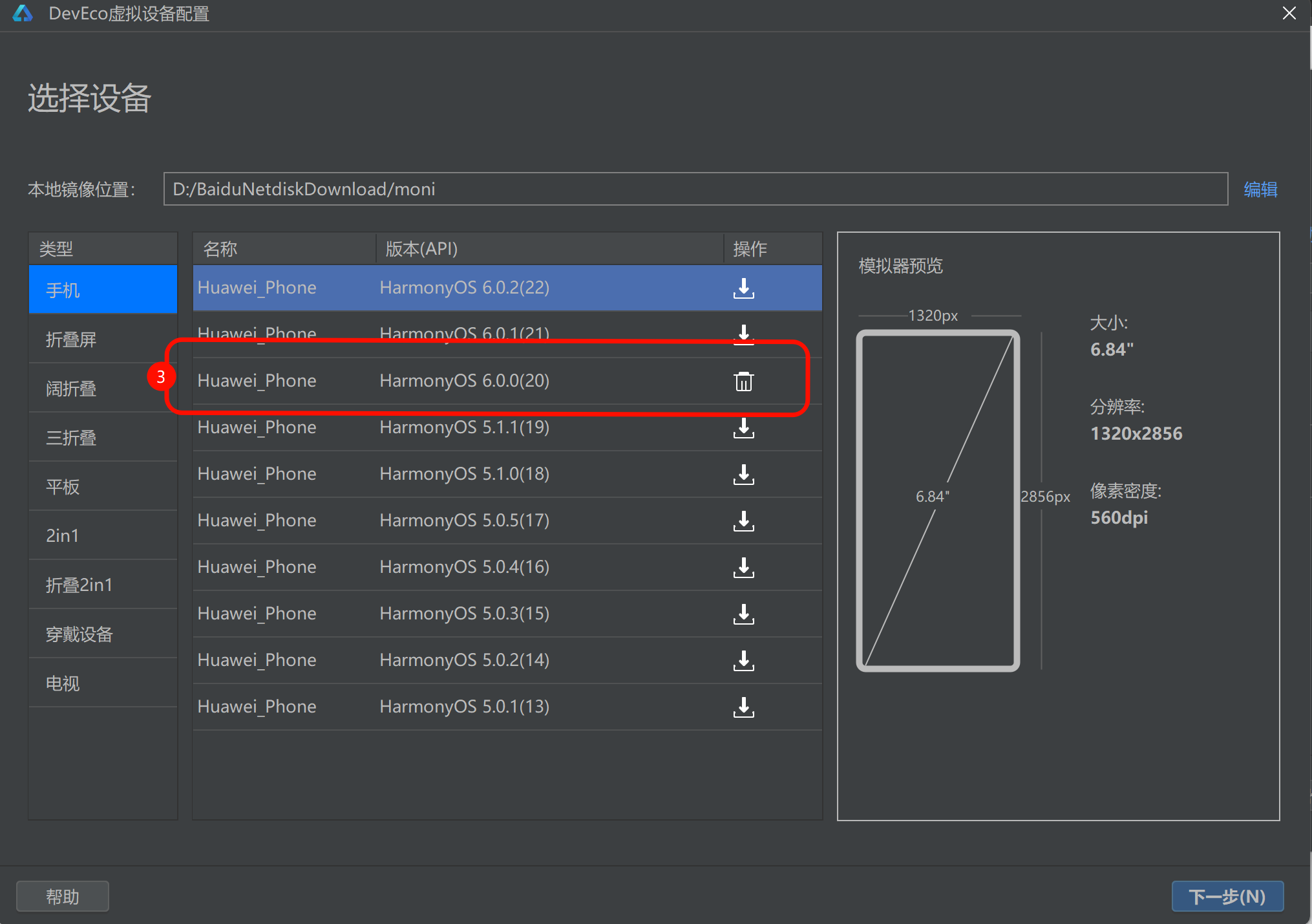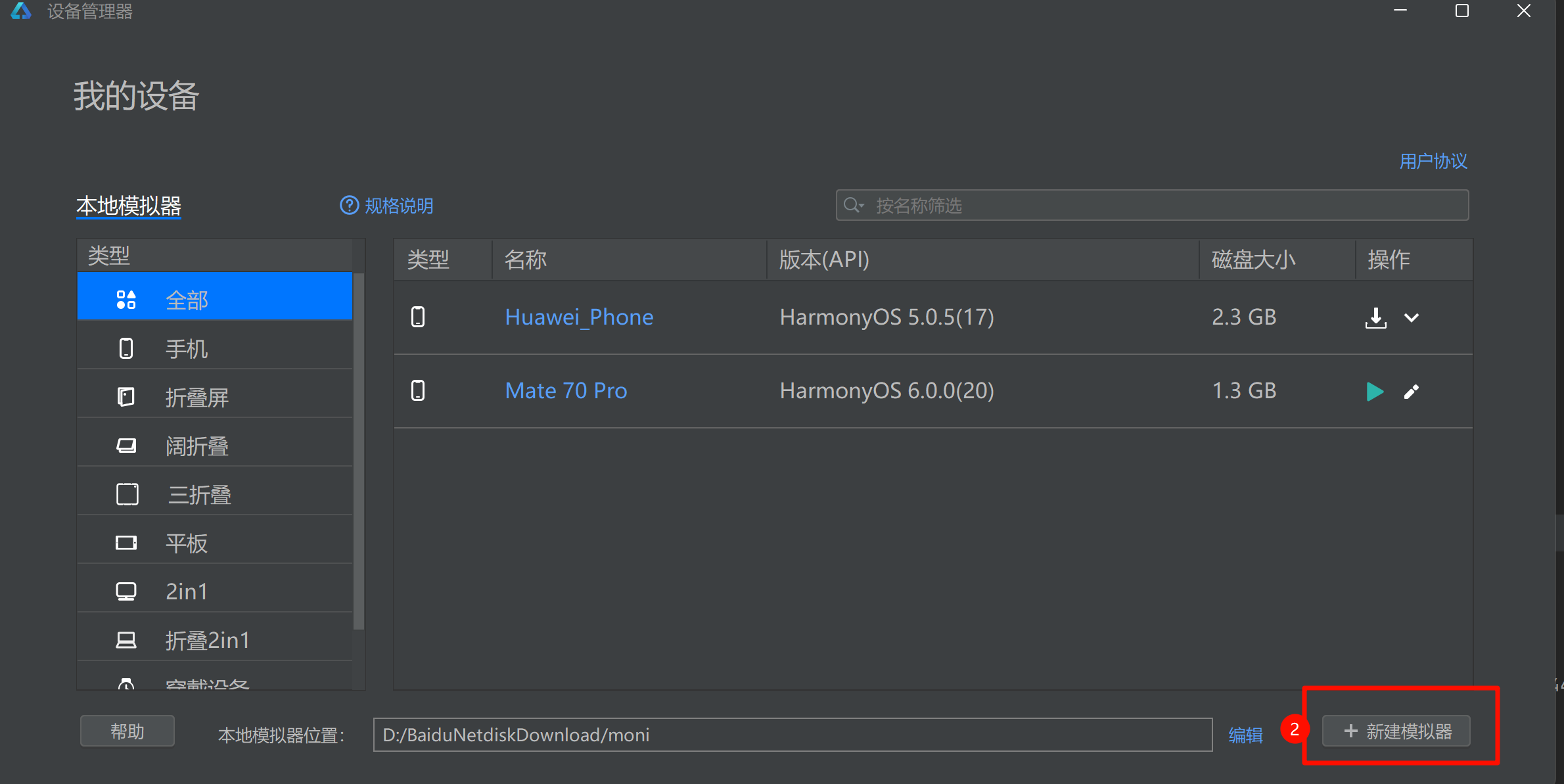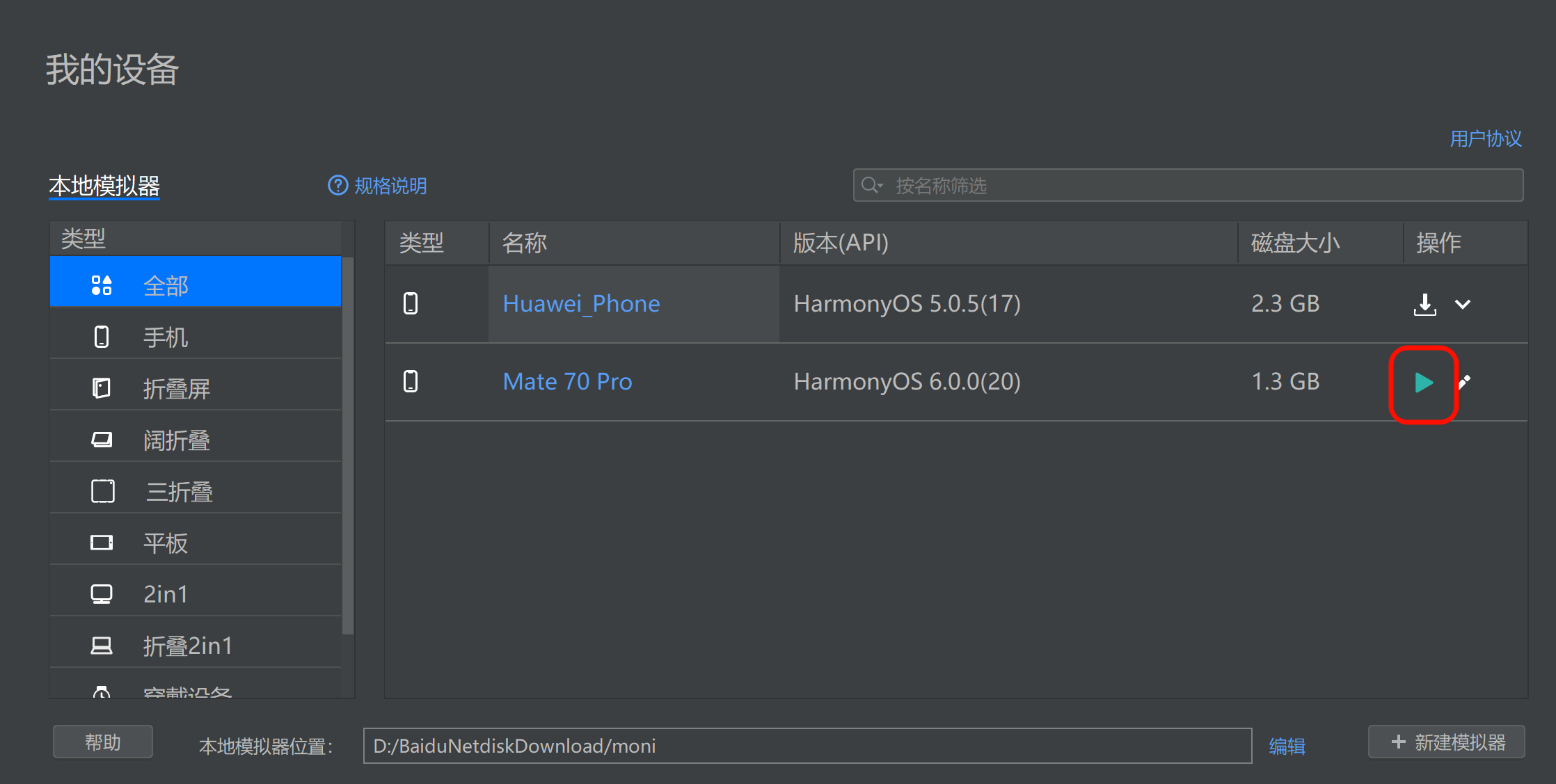 通过Tools->Device Manager创建HarmonyOS 6.0+模拟器