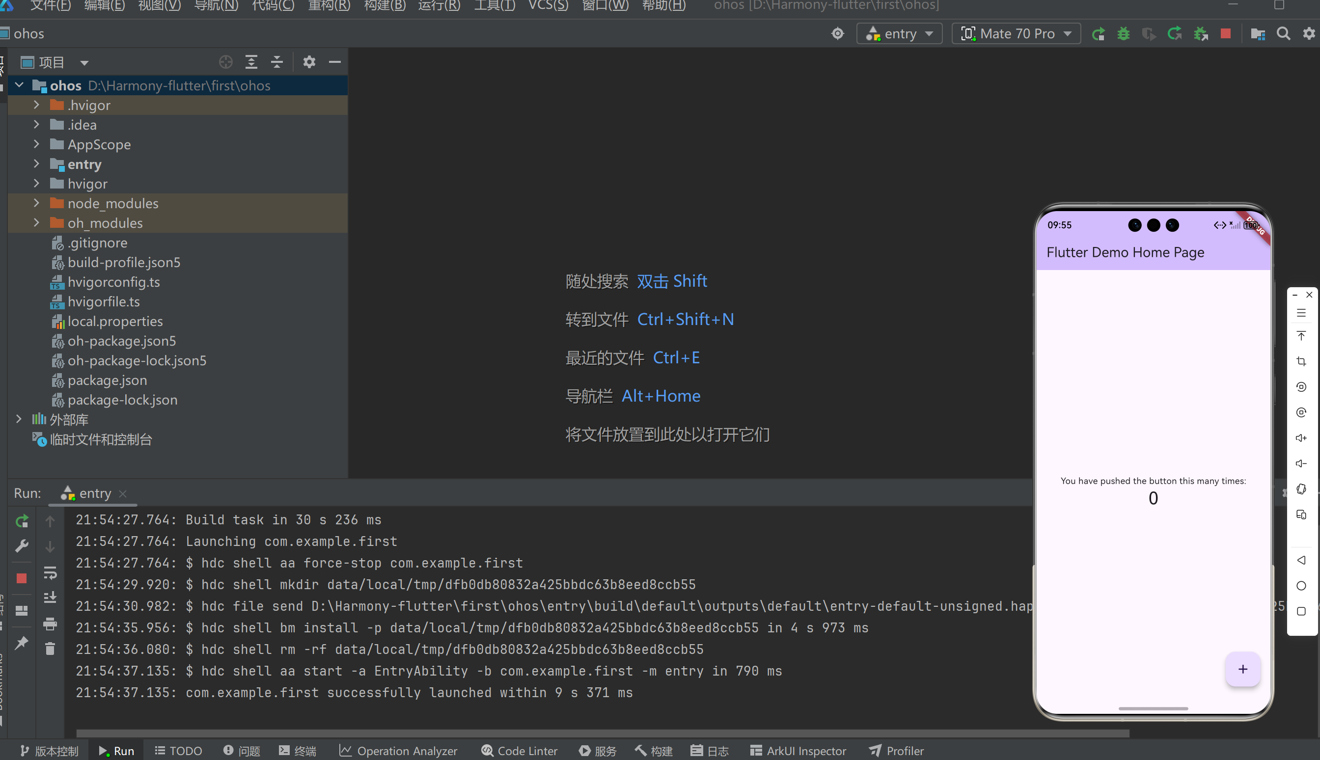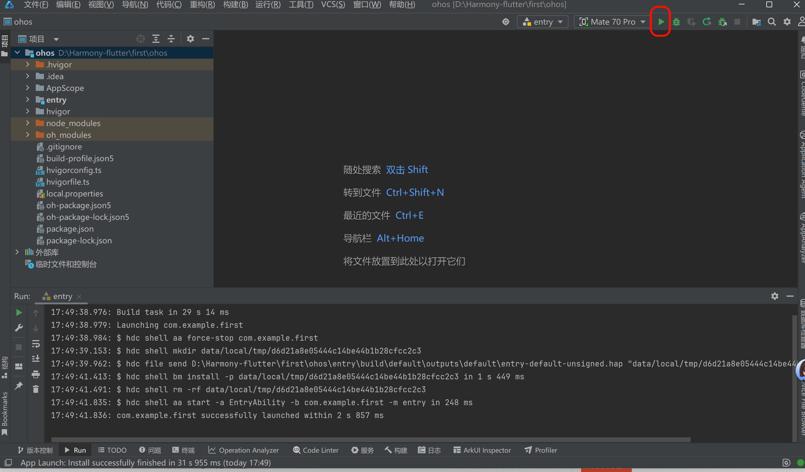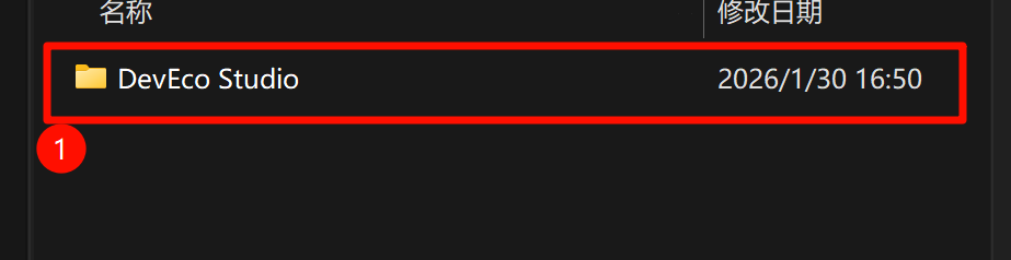 打开Deveco Studio中的文件File,选择open并且找到创建的项目名称下的ohos,可以看到ohos会有Deveco Studio的标识,然后打开,打开后在DevEco Studio中: