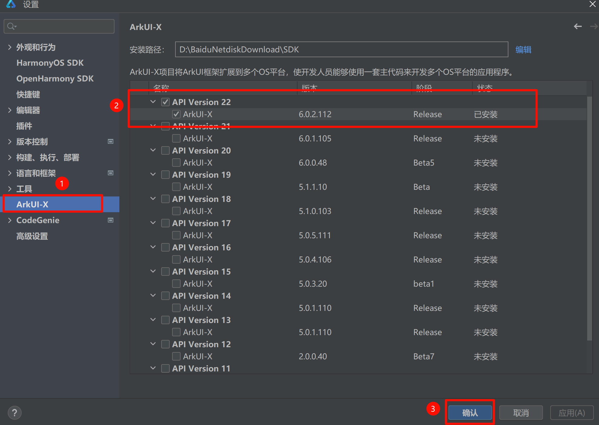 再找到ArkUI-X,勾选图片中打勾的API版本,再点击确认进行下载。