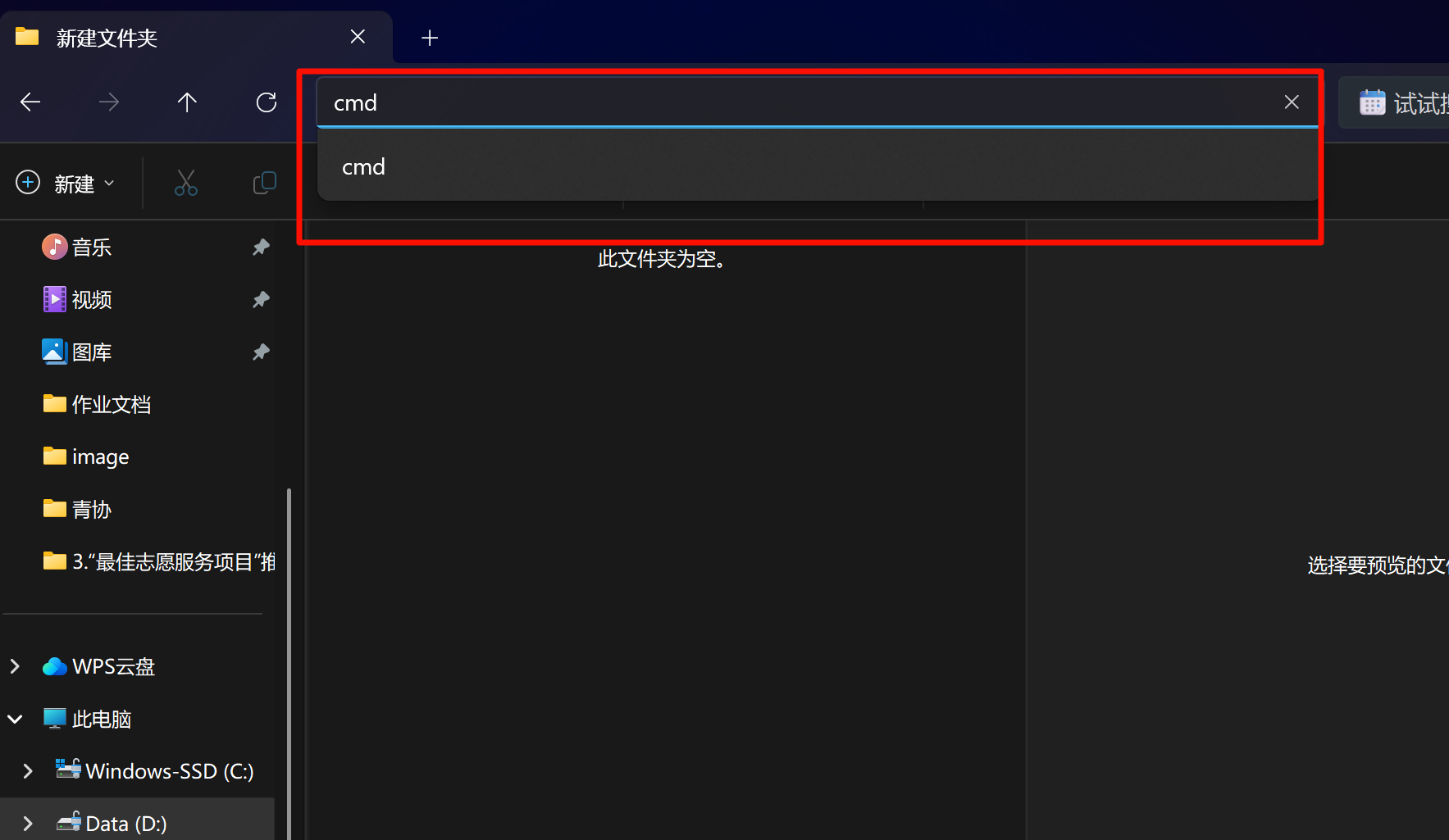 先新建一个文件夹,进入文件夹,输入cmd后回车,打开命令提示符