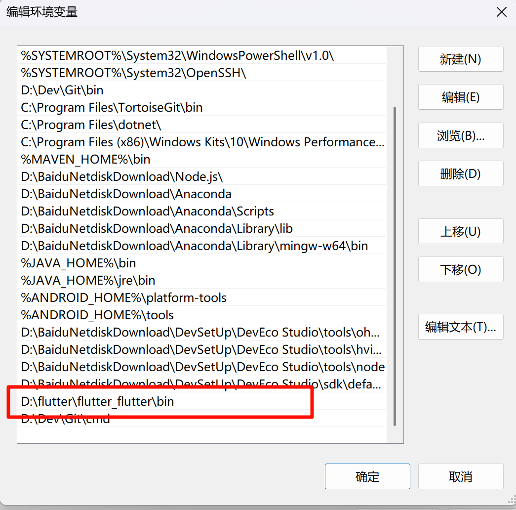 进入flutter_flutter文件里,找到bin文件,复制bin文件路径,添加到Path变量里: