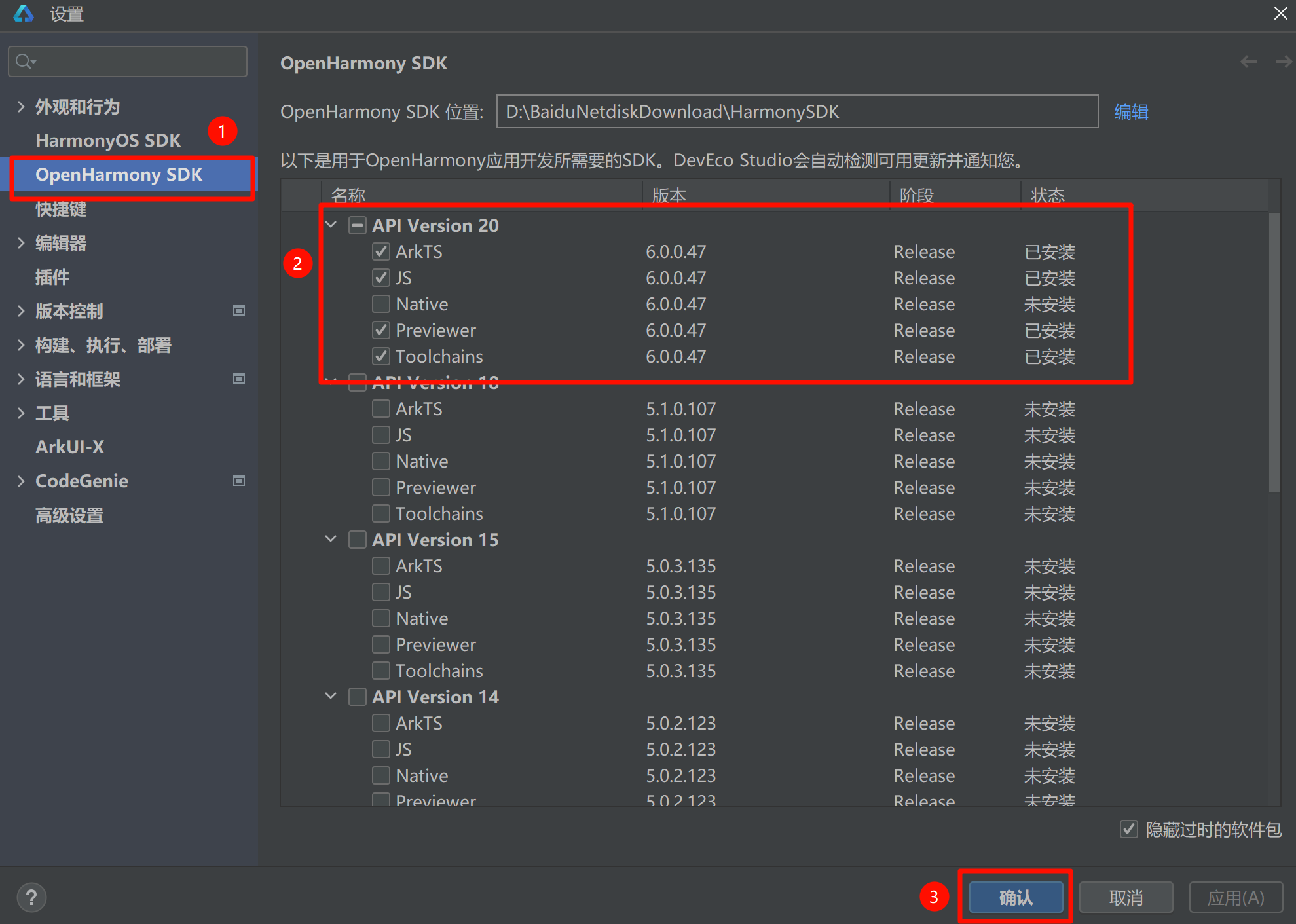 点进去后找到OpenHarmony SDK,勾选图片中打勾的API版本,再点击确认进行下载。
