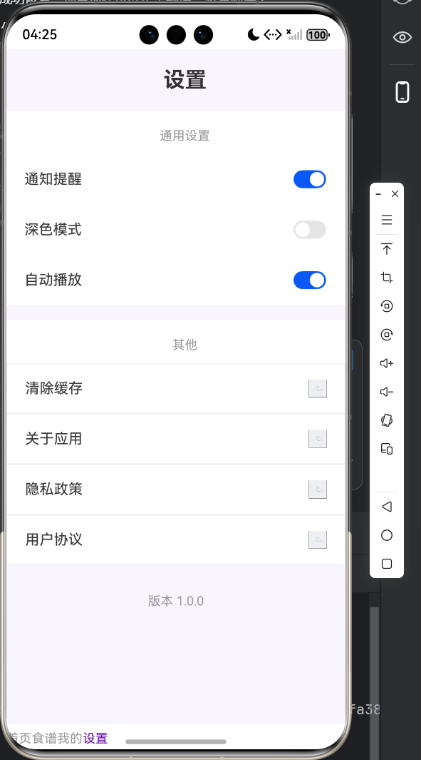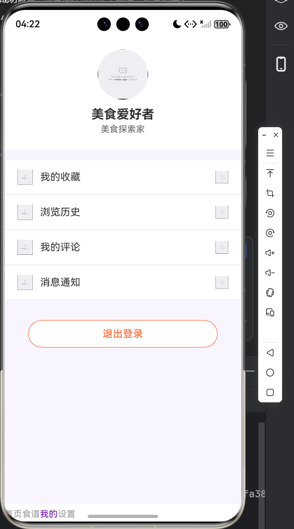 - 实现 4 个核心底部选项卡(首页、食谱列表、我的中心、设置)开发,完成 “默认 / 选中” 状态视觉差异化设计,支持页面平滑切换;