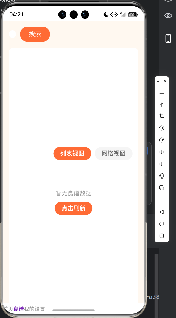 - 切换到食谱列表页,保留了之前的 “暂无数据” 状态与下拉刷新触发区域