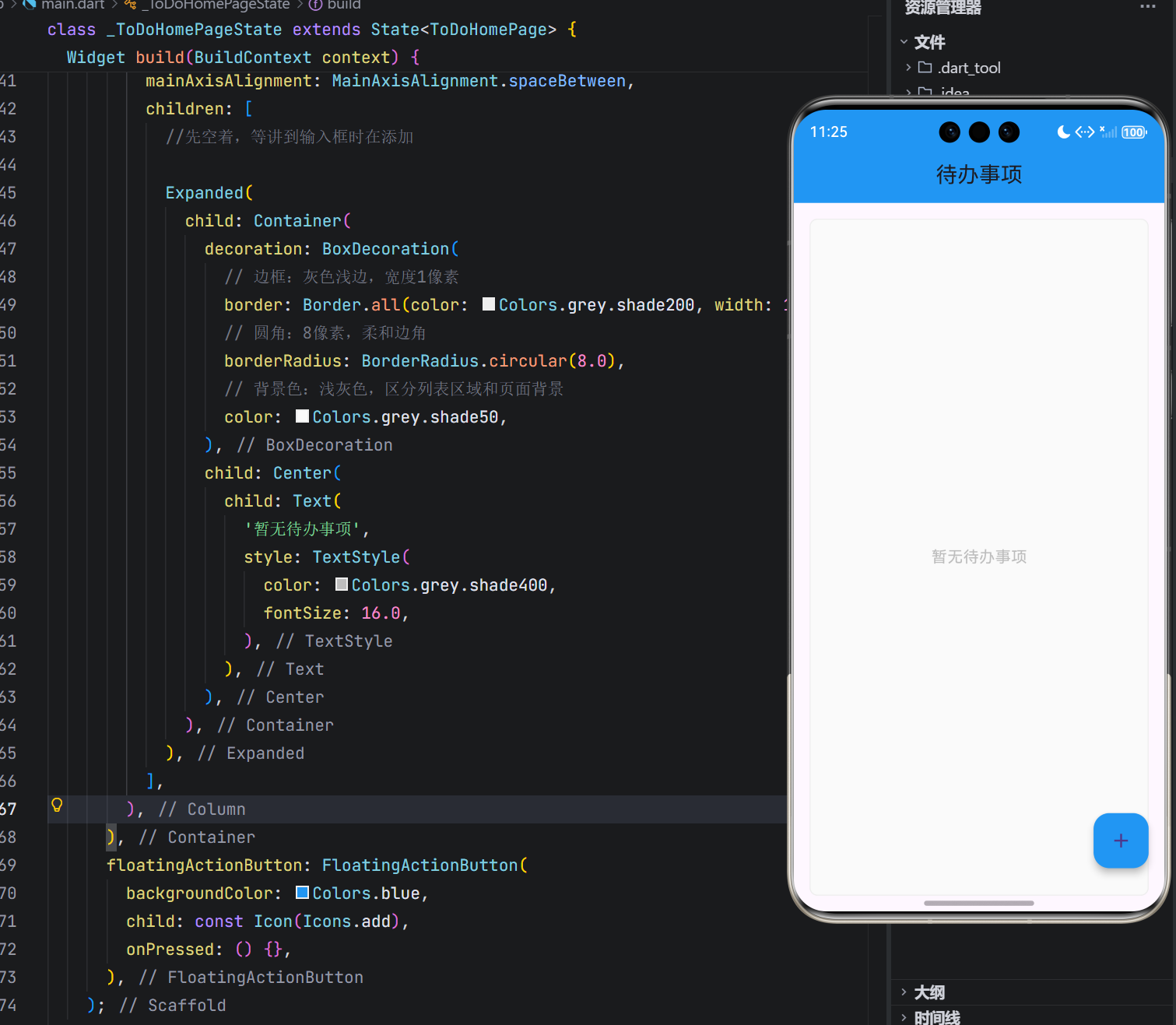 至此,已经完成了待办清单主界面的核心布局搭建 —— 从无状态的基础页面,升级为包含Scaffold完整属性、Column+Expanded布局逻辑、Container样式美化的有状态页面框架。不仅是实现了 “标题栏 + 输入框占位 + 任务列表区域 + 悬浮按钮” 的视觉效果,更重要的是掌握了 Flutter 布局的核心思维: