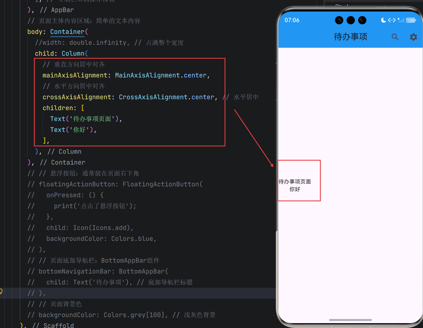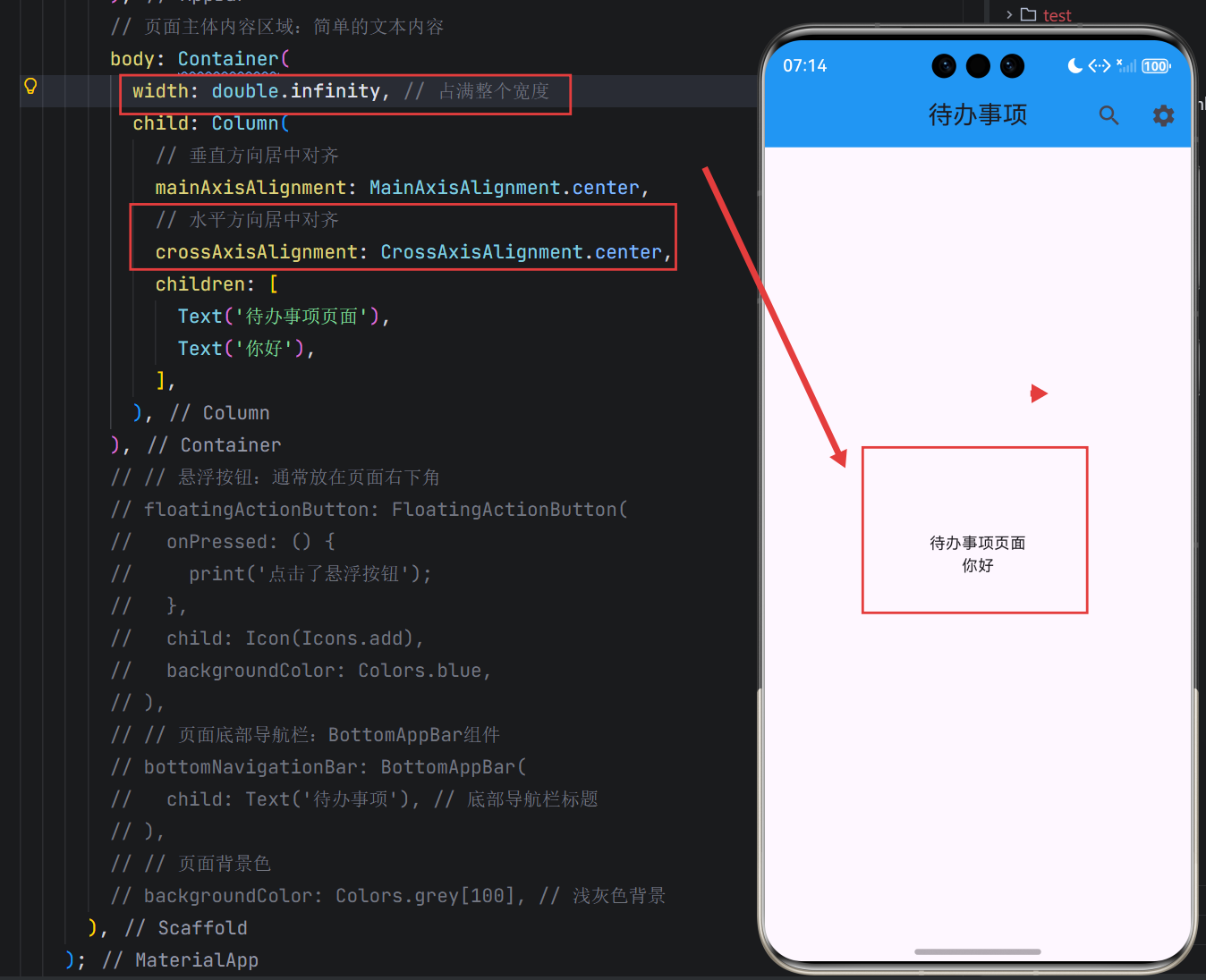 • 水平居中效果 :当 Column 宽度等于内容宽度时, crossAxisAlignment: CrossAxisAlignment.center 就看不出效果了,因为内容已经填满了 Column 的宽度