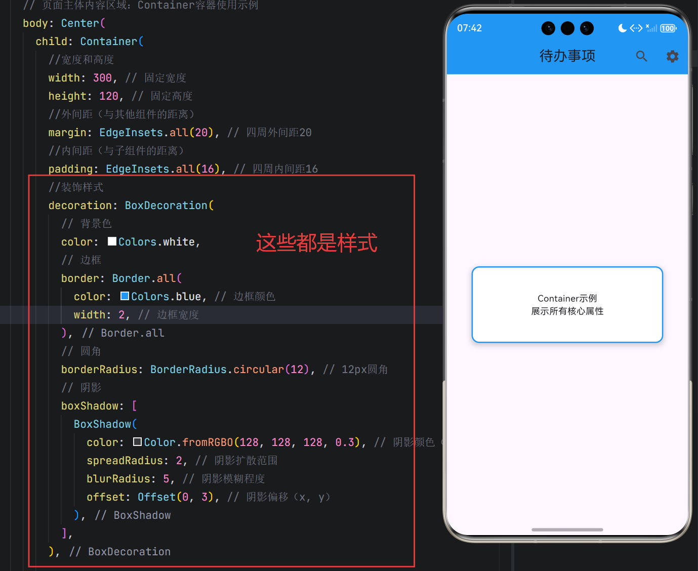 • 作用:通用容器组件,用于包裹其他 Widget,实现宽高、背景、边框、圆角、边距等样式设置