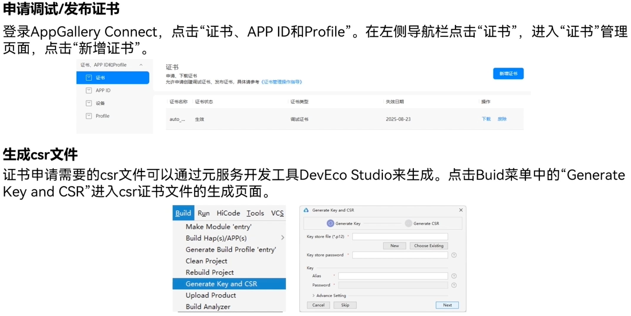 调试/发布证书是由AGC颁发的、为元服务配置签名信息的数字证书,可保障软件代码完整性和发布者身份真实性。证书格式为.cer,包含公钥、证书指纹等信息。