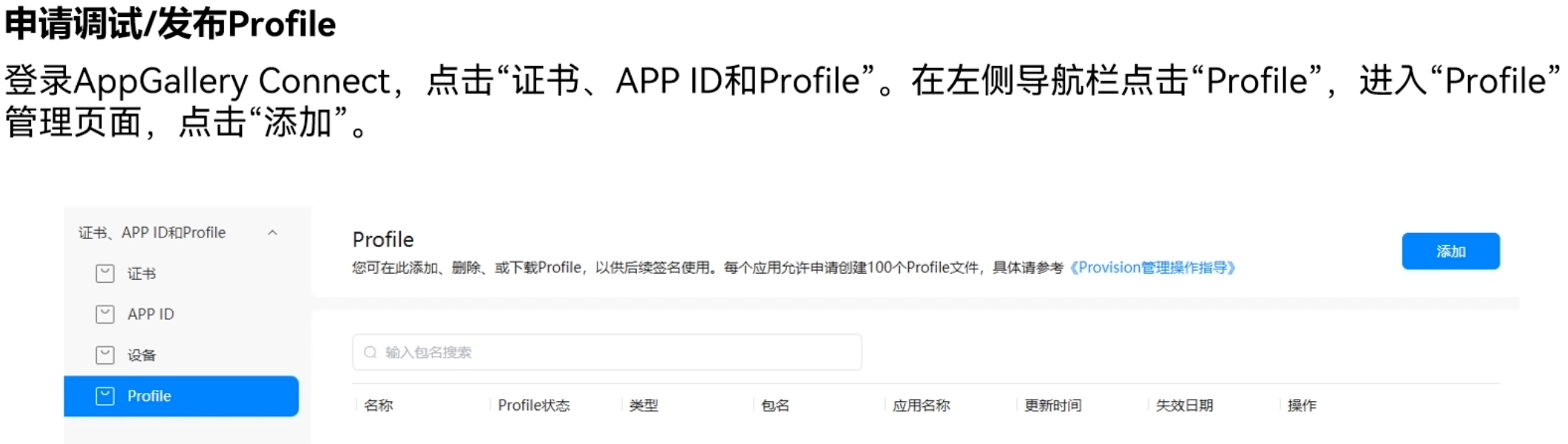 发布Profile格式为.p7b,包含元服务的包名、数字证书信息、元服务允许申请的证书权限列表,以及允许元服务调试的设备列表(如果元服务类型为Release类型,则设备列表为空)等内容。每个元服务包中必须包含一个Profile文件。