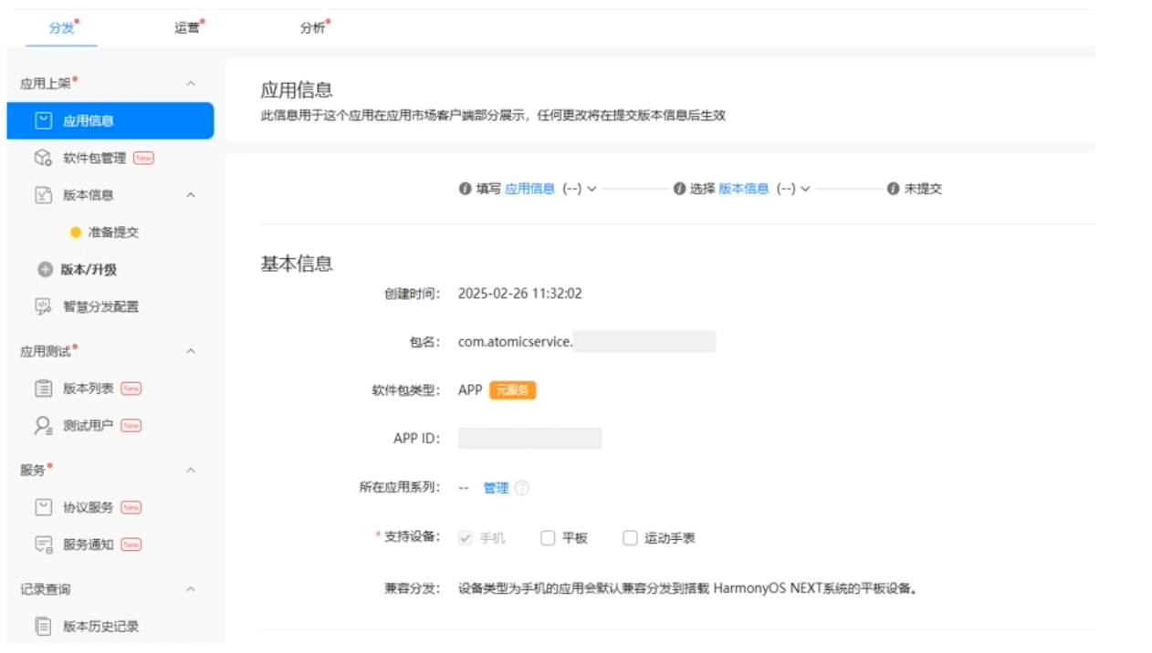 元服务的应用名称下会标识“元服务”属性,以便于进行区分。并且,元服务创建成功后会自动生成包名,可在应用列表或应用信息页面查看到。包名格式: com.atomicservice.[APP ID]。