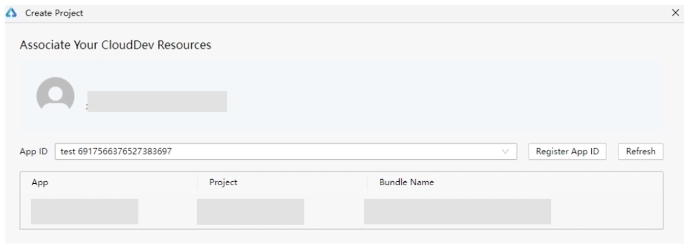创建过程中需要输入开发者账号,登录成功后在下面页面选择创建好的元服务项目。