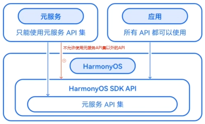 元服务开发基于HarmonyOS SDK,使开发元服务“更简单、更高效”。元服务只能使用元服务API集,应用可以使用全量的API;元服务API集是元服务仅能使用的API,是HarmonyOS SDK API的一部分;元服务API仍归属于各个Kit;