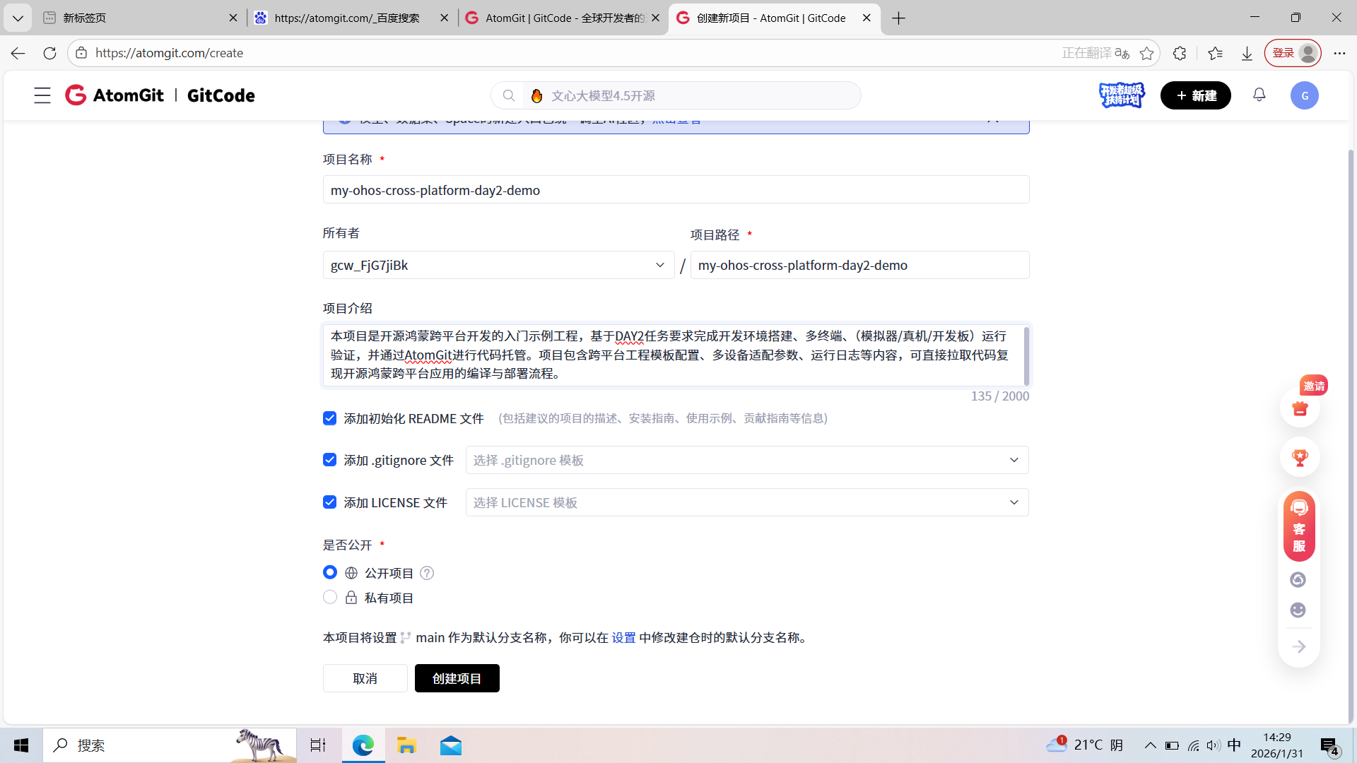 my-ohos-demo),说明项目已准备好; - 若「我的项目」页面是空的(没创建过),按以下步骤新建公开项目: