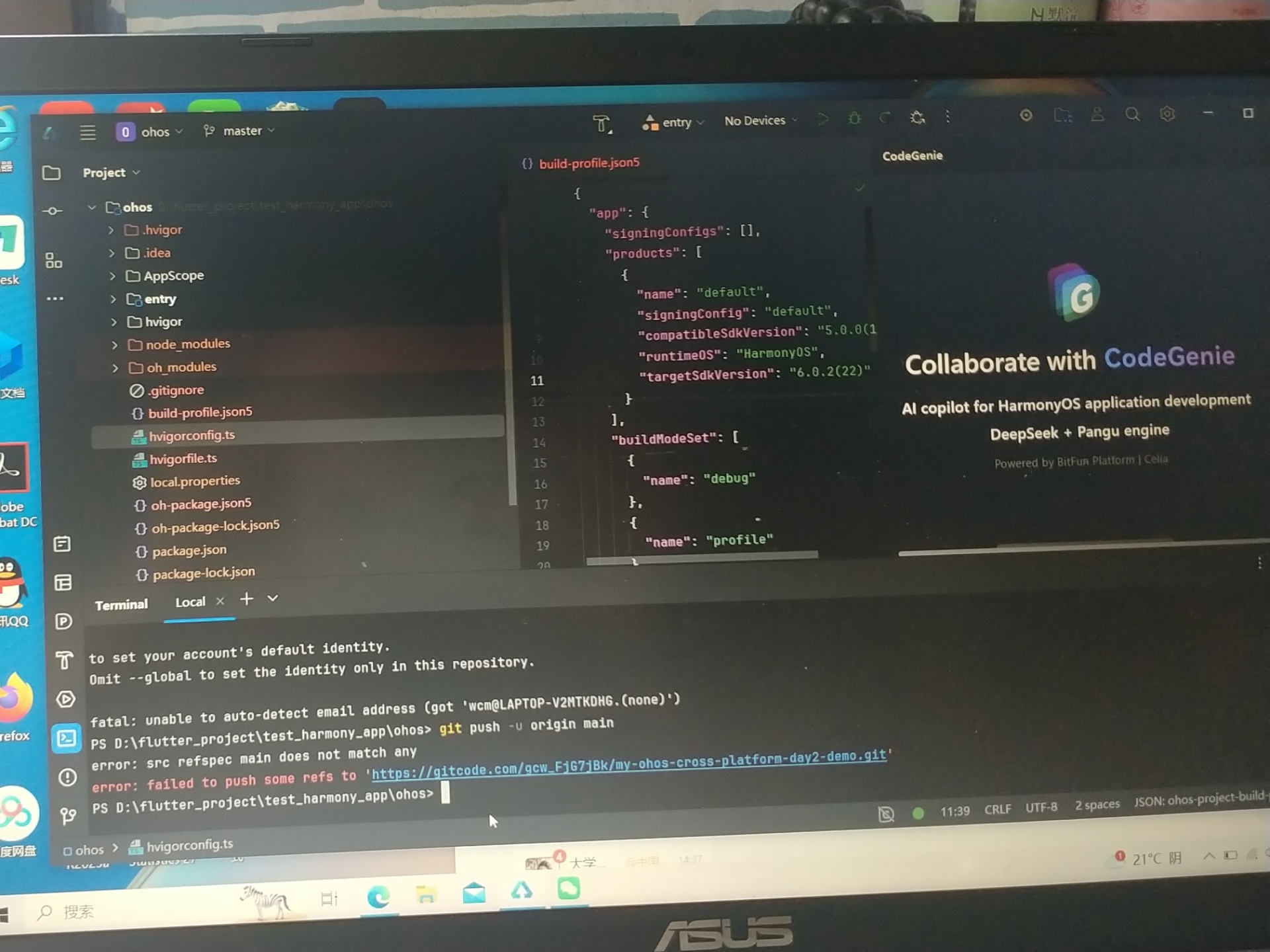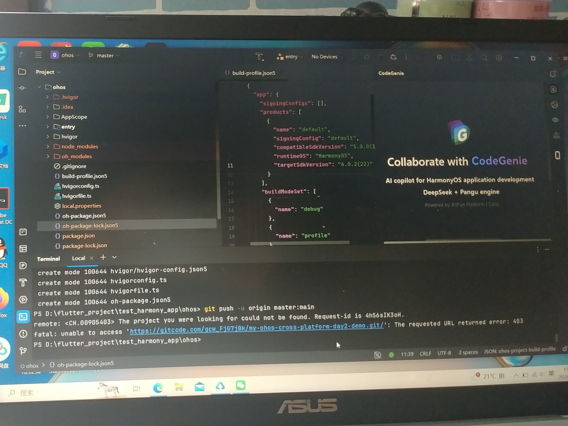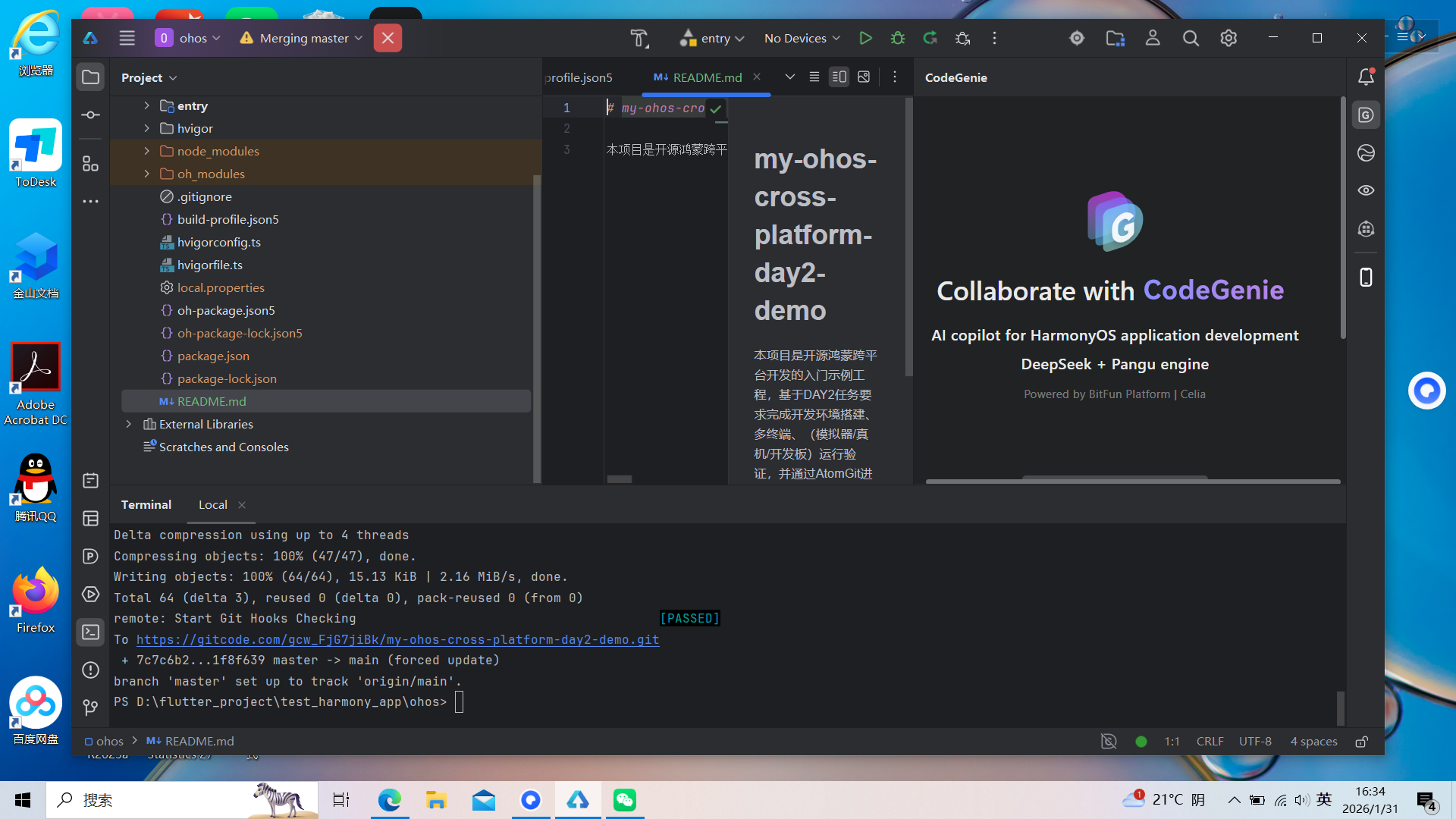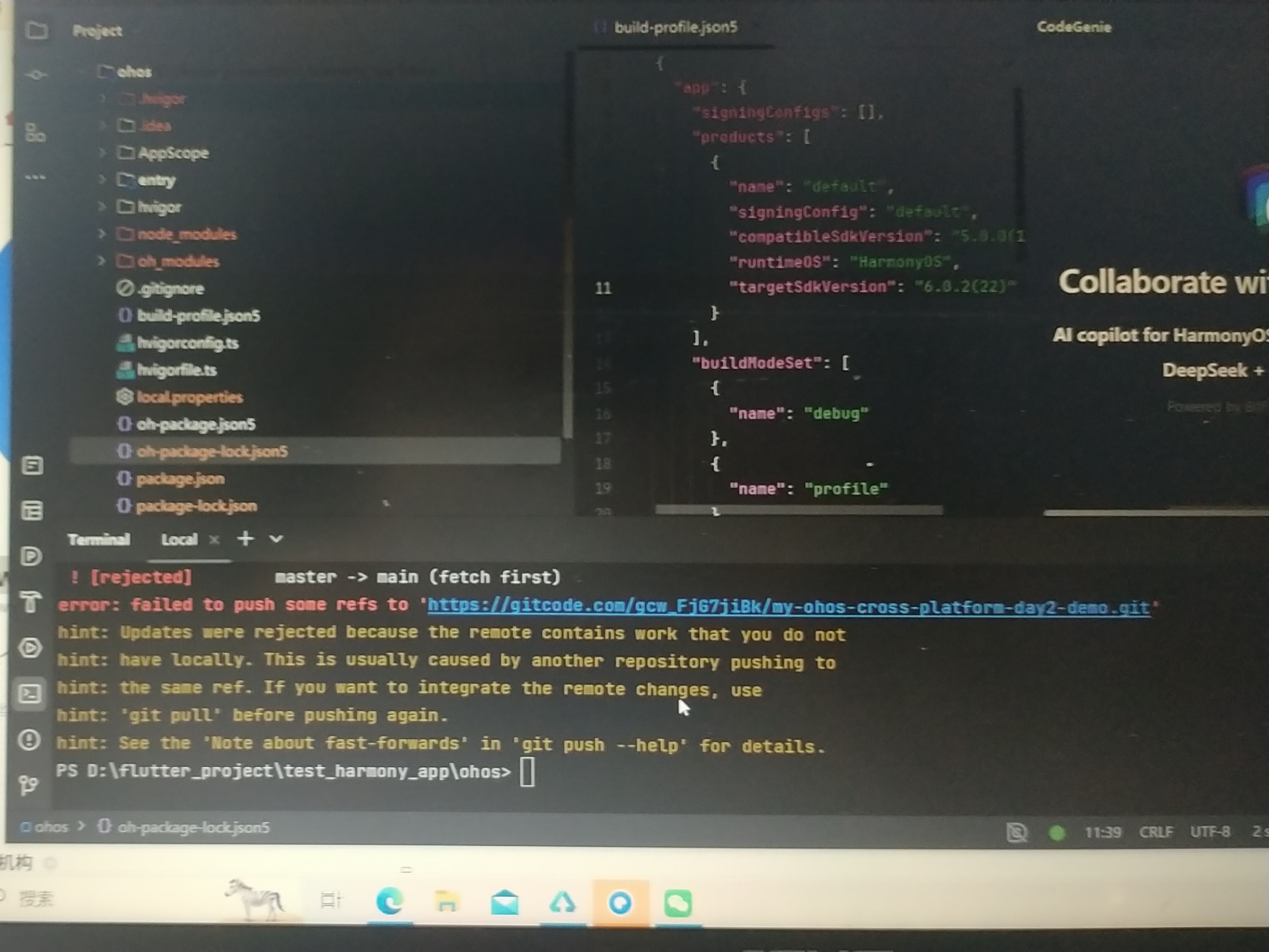 2. 刷新 Gitcode 仓库页面 打开你的仓库页面: https://gitcode.com/gcw_FjG7jiBk/my-ohos-cross-platform-day2-demo 刷新页面后,你应该能看到刚刚推送的代码文件(比如build-profile.json5 、 hvigorfile.ts等)出现在文件列表里。git remote add origin https://gitco