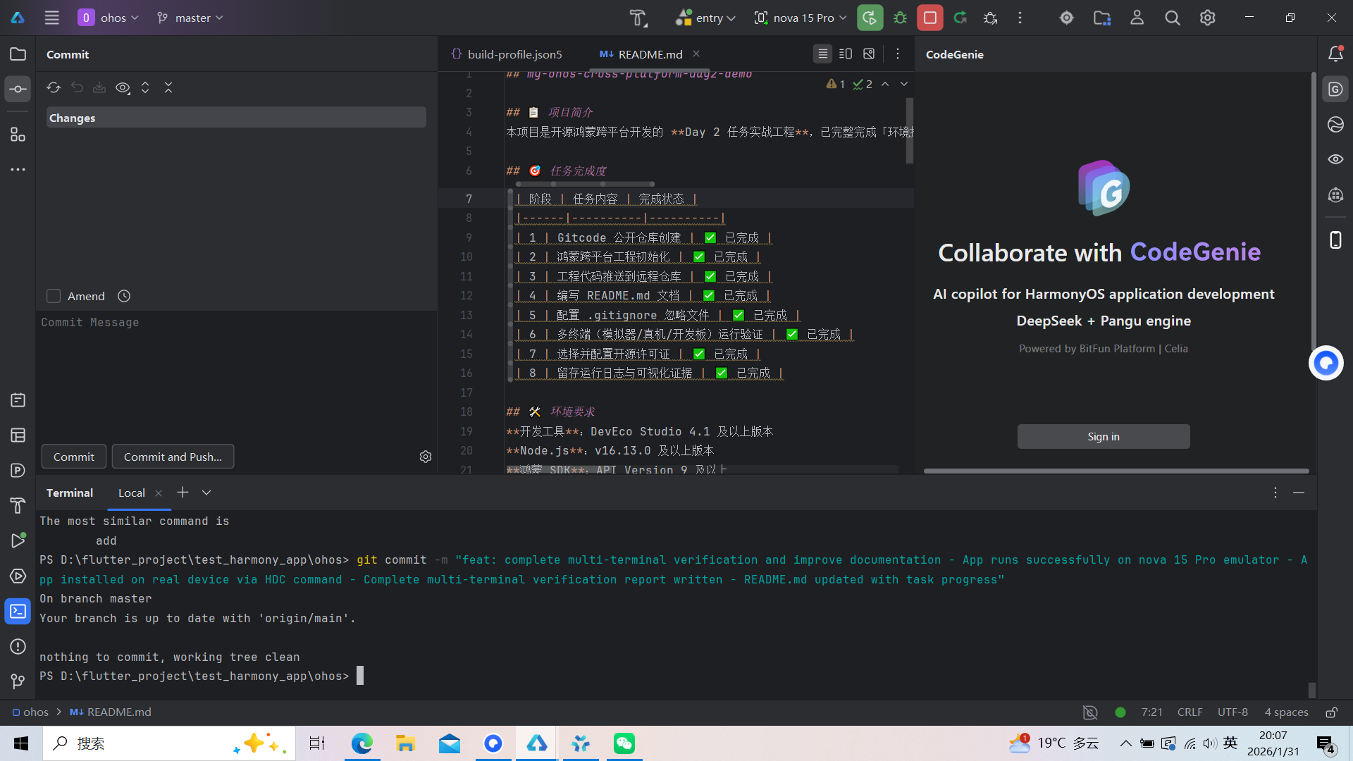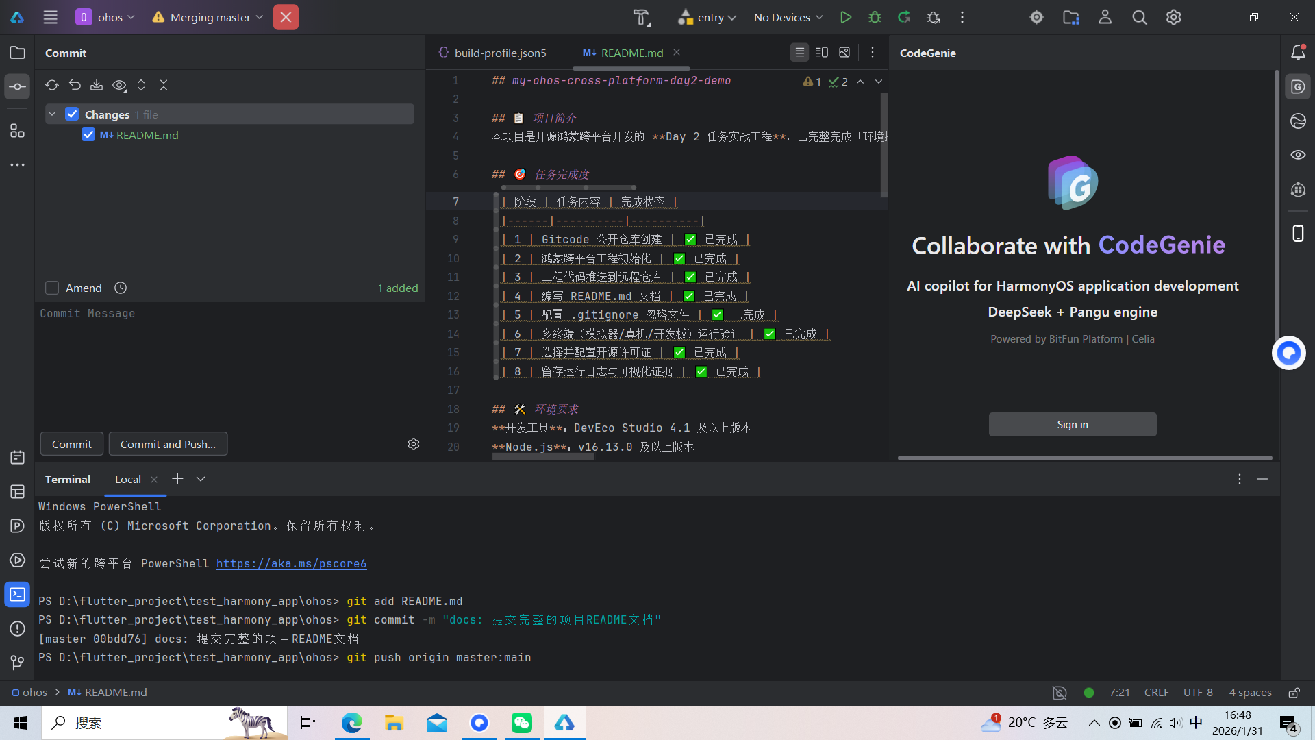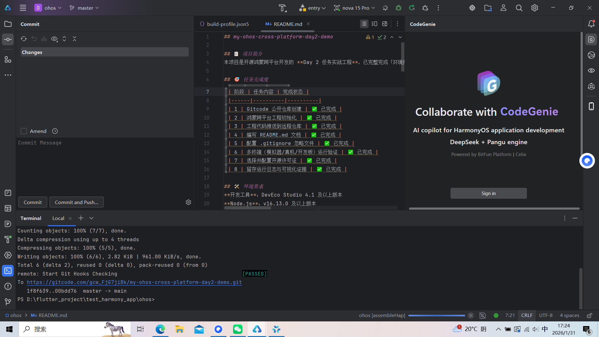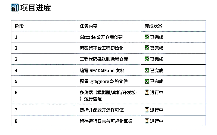从工程搭建到云端托管,从模拟器测试到真机验证,这次 Day2 实战让我彻底摸清了开源鸿蒙跨平台开发的基本流程。不仅掌握了 Git 提交推送的核心命令,还学会了处理文档格式错误、进程冲突等常见问题。