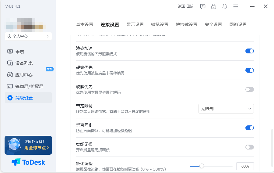 而且每种模式里,你还能自主调整画质、带宽限制、渲染加速、锐化效果等细节,调整好的设置可以保存为预设,下次再用直接调用,不用重复调整,个性化又省心。