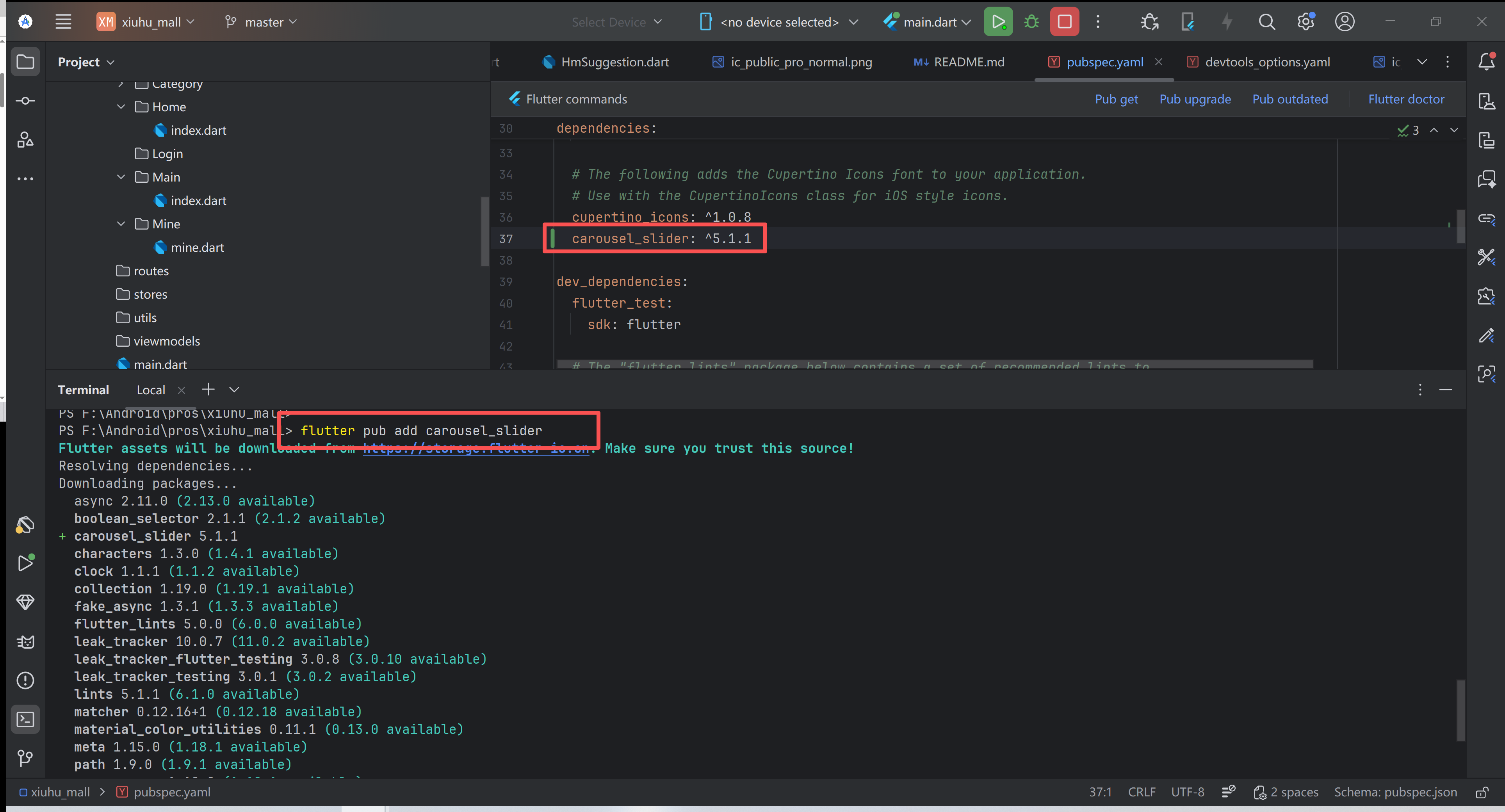 flutter pub add carousel_slider - 看到"carousel_slider"这个插件有版本号,说明插件已成功引入。