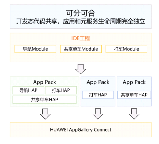 在传统移动生态下,开发者通常需要开发一个原生应用版本,如果提供小程序给用户,往往需要开发若干个独立的小程序。在HarmonyOS生态下,HarmonyOS原生支持元服务开发,开发者无须维护多套版本,而是通过业务解耦将应用分解为若干元服务独立开发,再按需根据场景组合成复杂应用。
