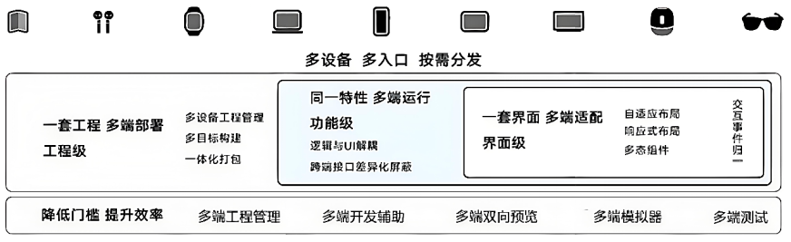 “一次开发,多端部署”指的是一个工程,一次开发上架,多端按需部署。其目的是支撑开发者高效地开发多种终端设备上的应用。为了实现这一目的,HarmonyOS提供了几个核心能力,包括多端开发环境、多端开发能力以及多端分发机制,如下图所示。