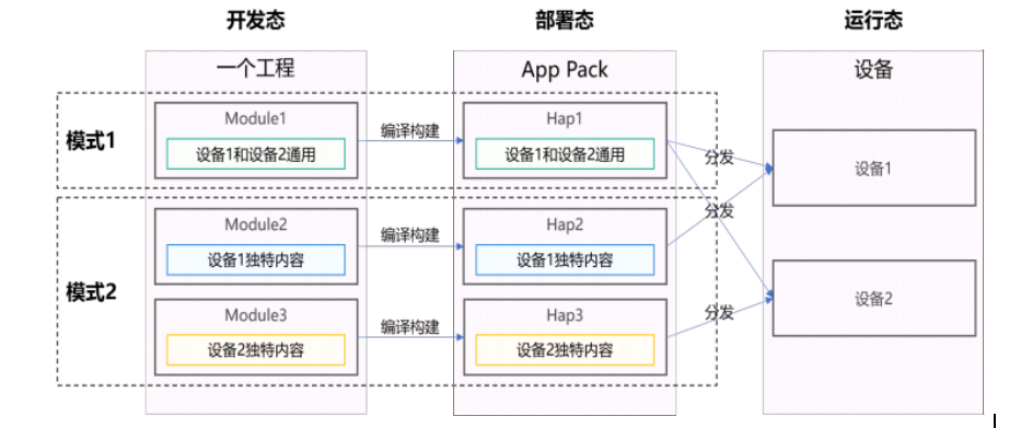 如果需要开发在多设备上运行的应用,一般会针对不同类型的设备多次开发并独立上架,因此开发和维护的成本较大。为了解决这个问题,HarmonyOS提供了“一次开发,多端部署”的能力,开发者开发多设备应用,只需要一套工程,一次打包出多个HAP,统一上架,即可根据设备类型按需进行分发,如下图所示。
