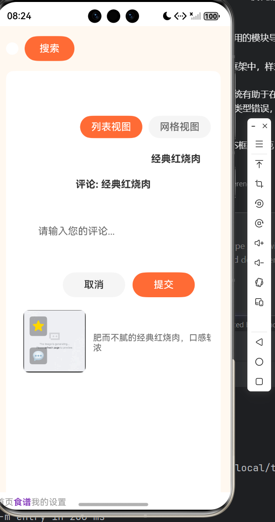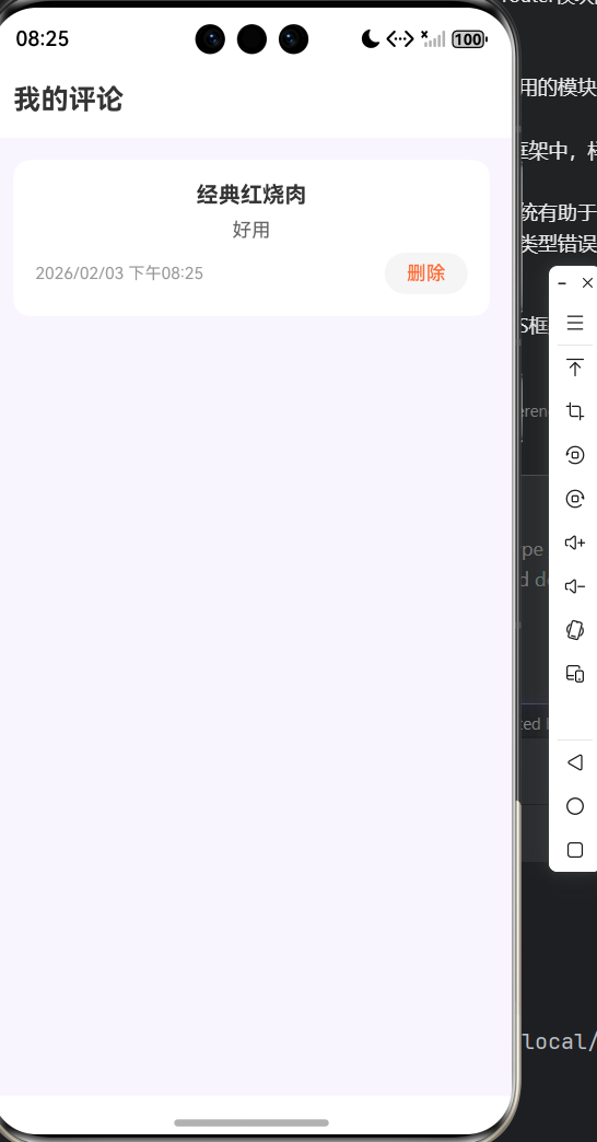 展示关联食谱、评论内容、时间、删除按钮,数据持久化,删除实时同步。