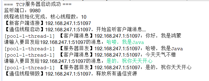 监听端口(ServerSocket)→ 线程池分配工作线程 → 读取客户端消息(按行解析) → 控制台输入回发消息 → 客户端接收并展示