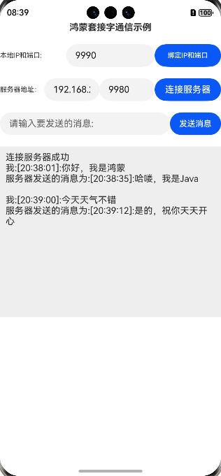 Text("鸿蒙套接字通信示例").width("100%").textAlign(TextAlign.Center).fontWeight(FontWeight.Bold)
